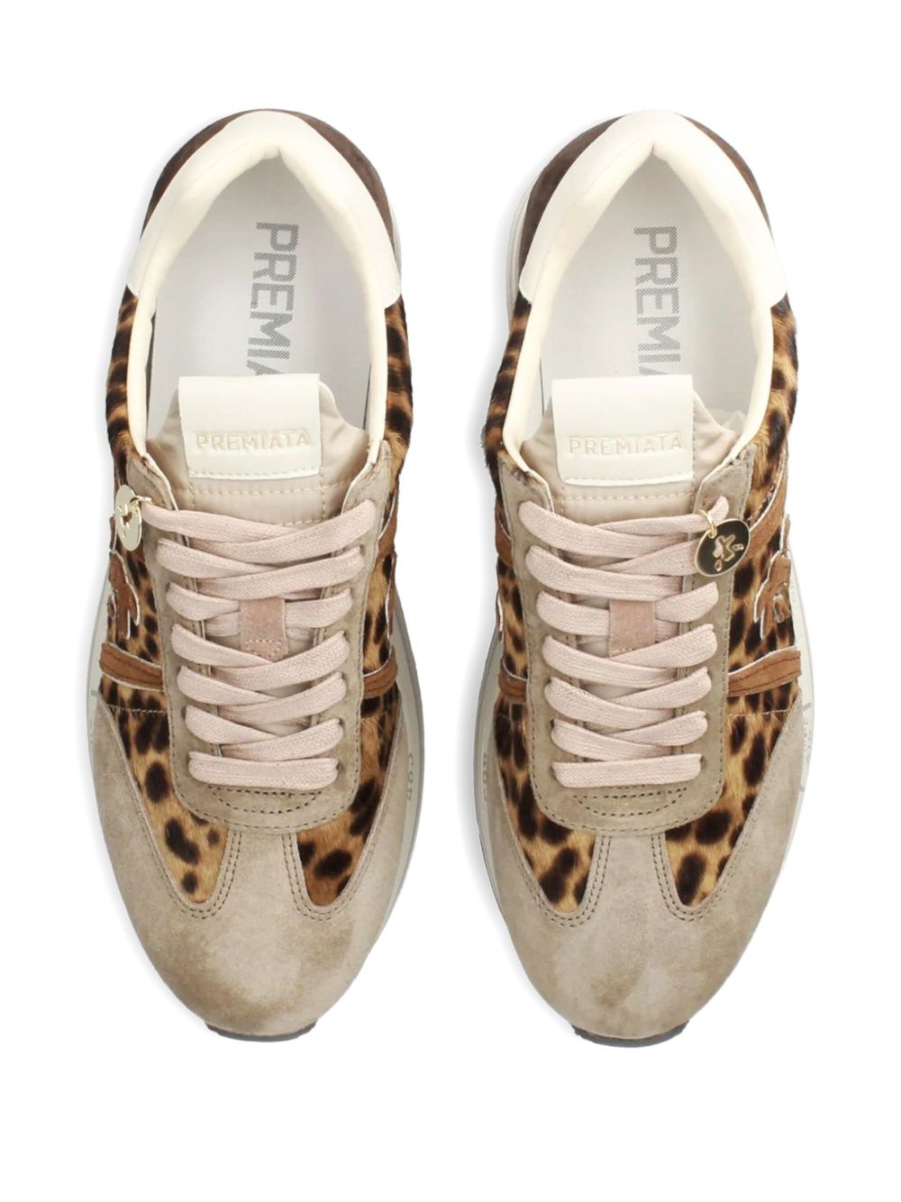 tomaia interamente realizzata in camoscio e pelle, fondo platform personalizzato con serigrafia logata, design animalier, altezza suola 5,5 cm