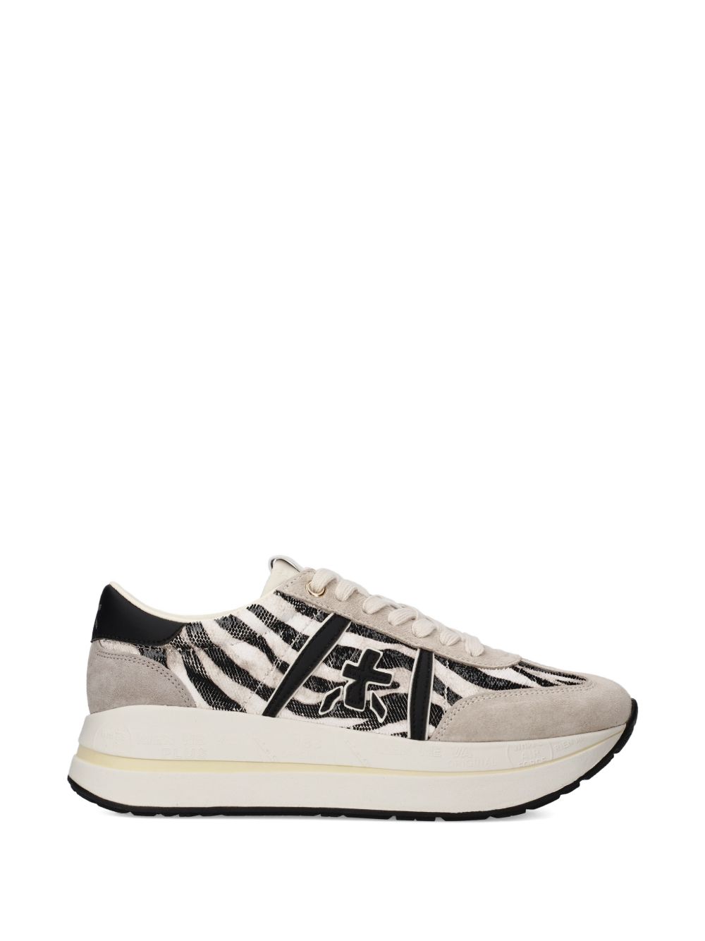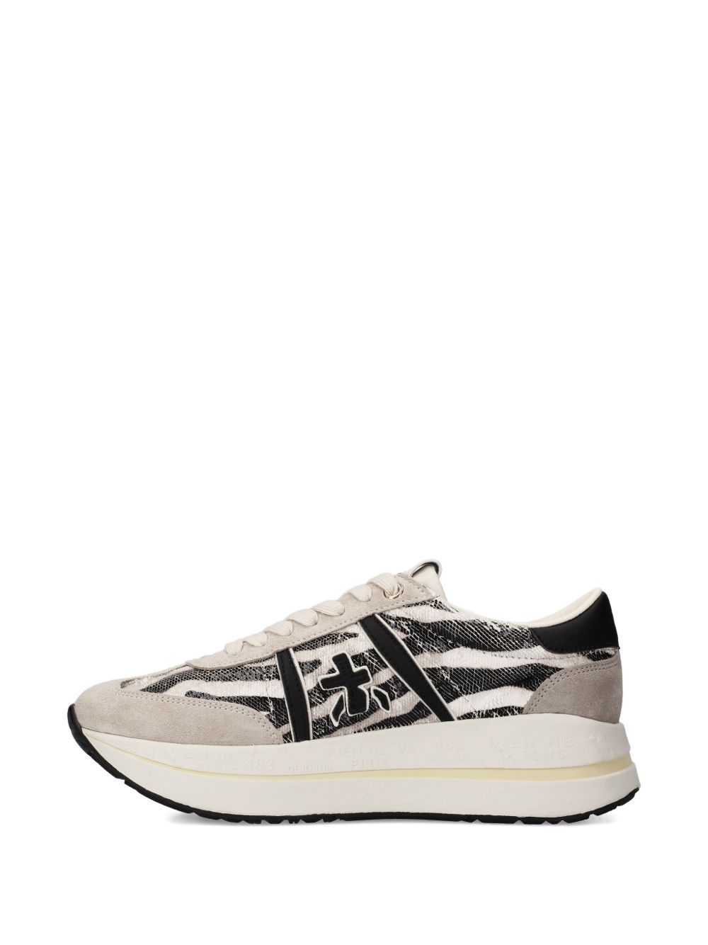 tomaia realizzata in pelle e tessuto, dettaglio con stampa animalier, logo laterale, suola alta in gomma