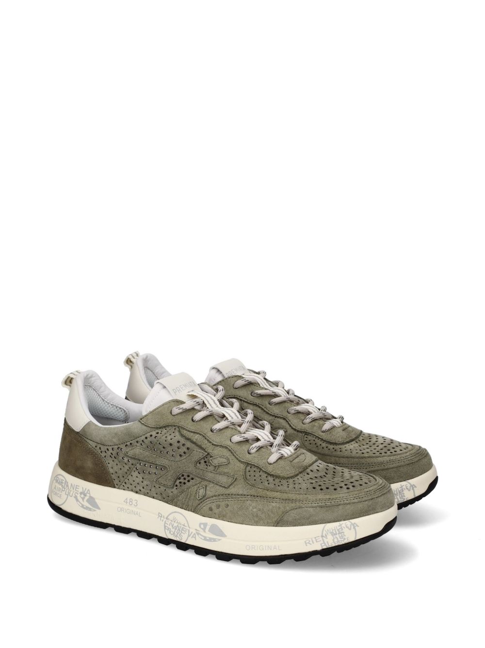 tomaia in pelle e tessuto traforata, macro logo laterale tono su tono, suola in gomma, altezza suola 3,5 cm