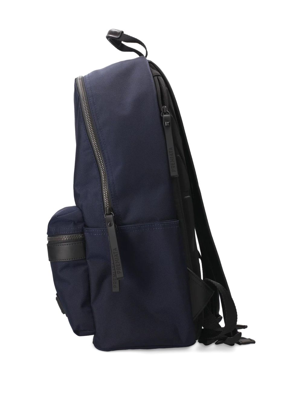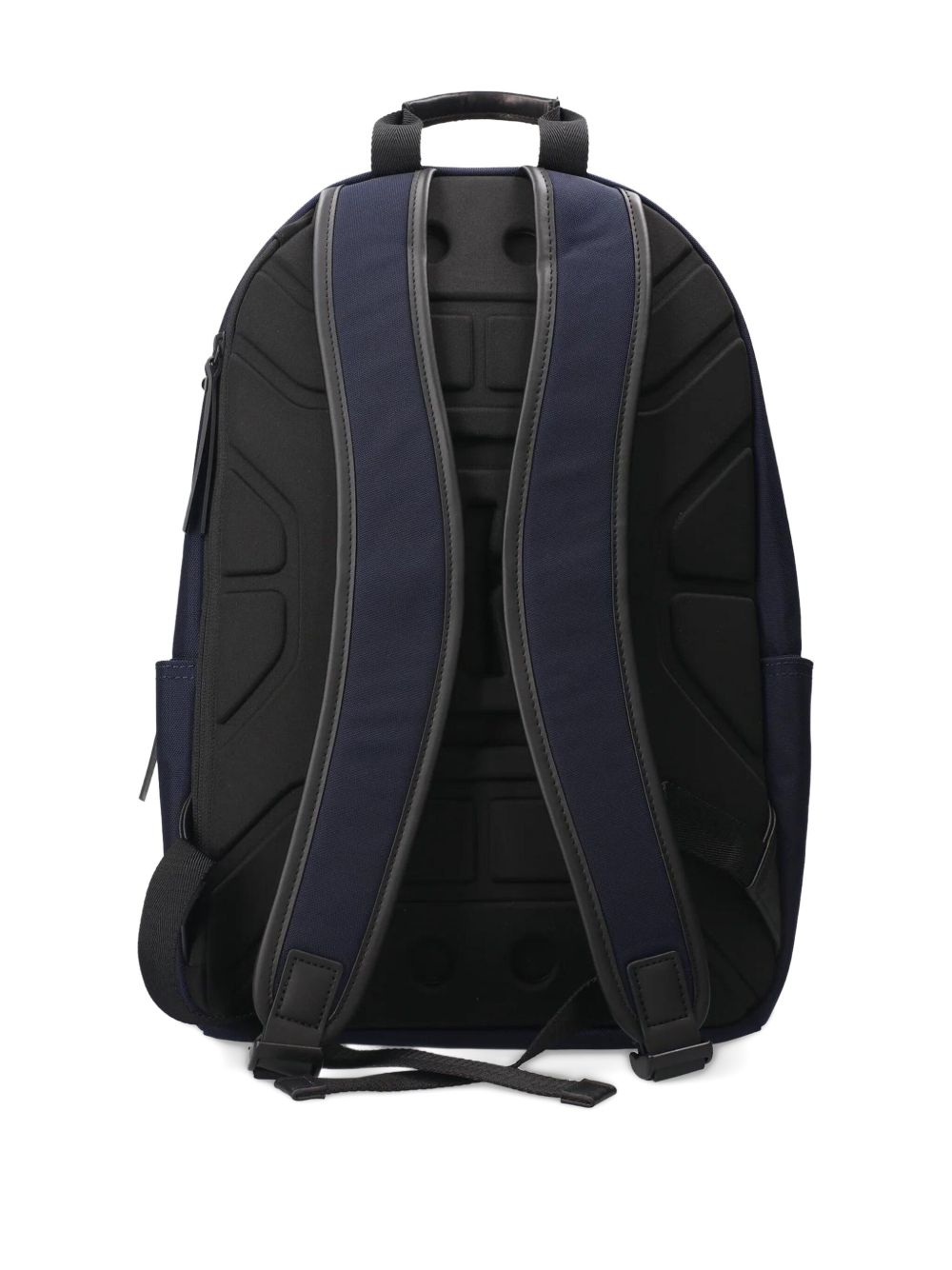 realizzato in gabardina di nylon, antisfilacciamento ed idrorepellente, spallacci regolabili imbottiti, tasche frontali impermeabili, dettagli in pelle di vitello, chiusure in metallo opaco, lunghezza 30 cm, altezza 40 cm, profondità 15 cm, manico 8 cm, spallacci 82 cm