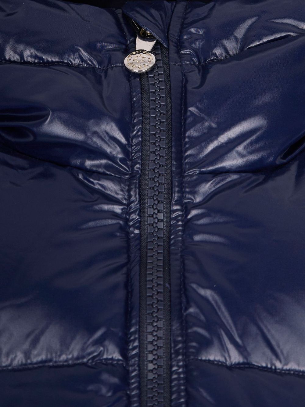 realizzato in poliammide, logo applicato sulla manica, cappuccio con coulisse, chiusura frontale con zip a doppio cursore, tasche zon zip, imbottitura in vera piuma