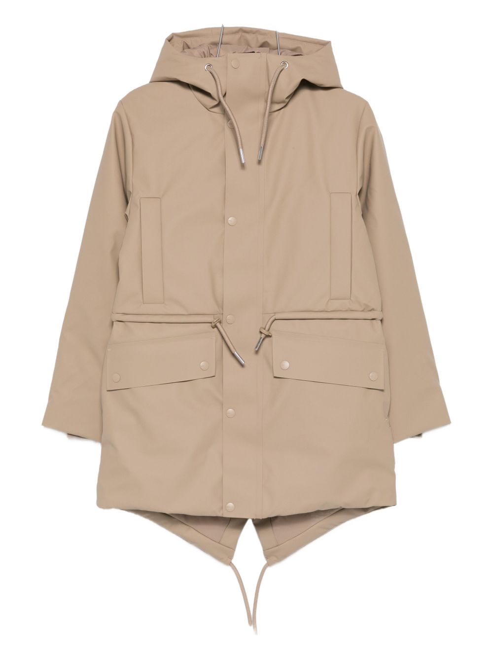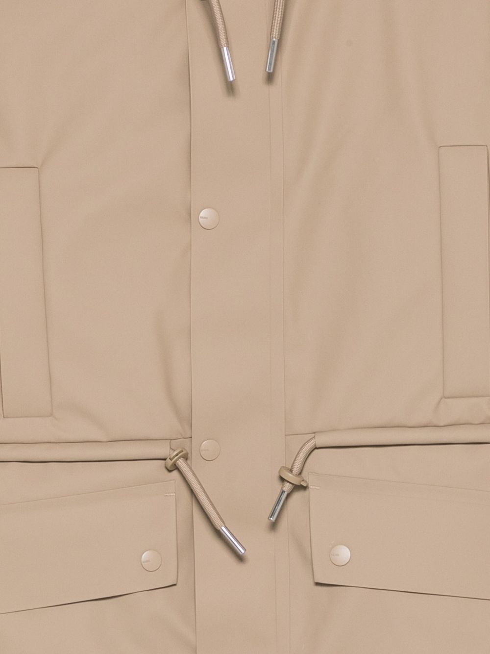 Il parka String W di Rains coniuga estetica urbana e funzionalità, offrendo la protezione perfetta per le mezze stagioni. Realizzato nelliconico tessuto PU waterproof del brand, presenta una struttura resistente, unimbottitura sottile e una texture liscia dal look essenziale.