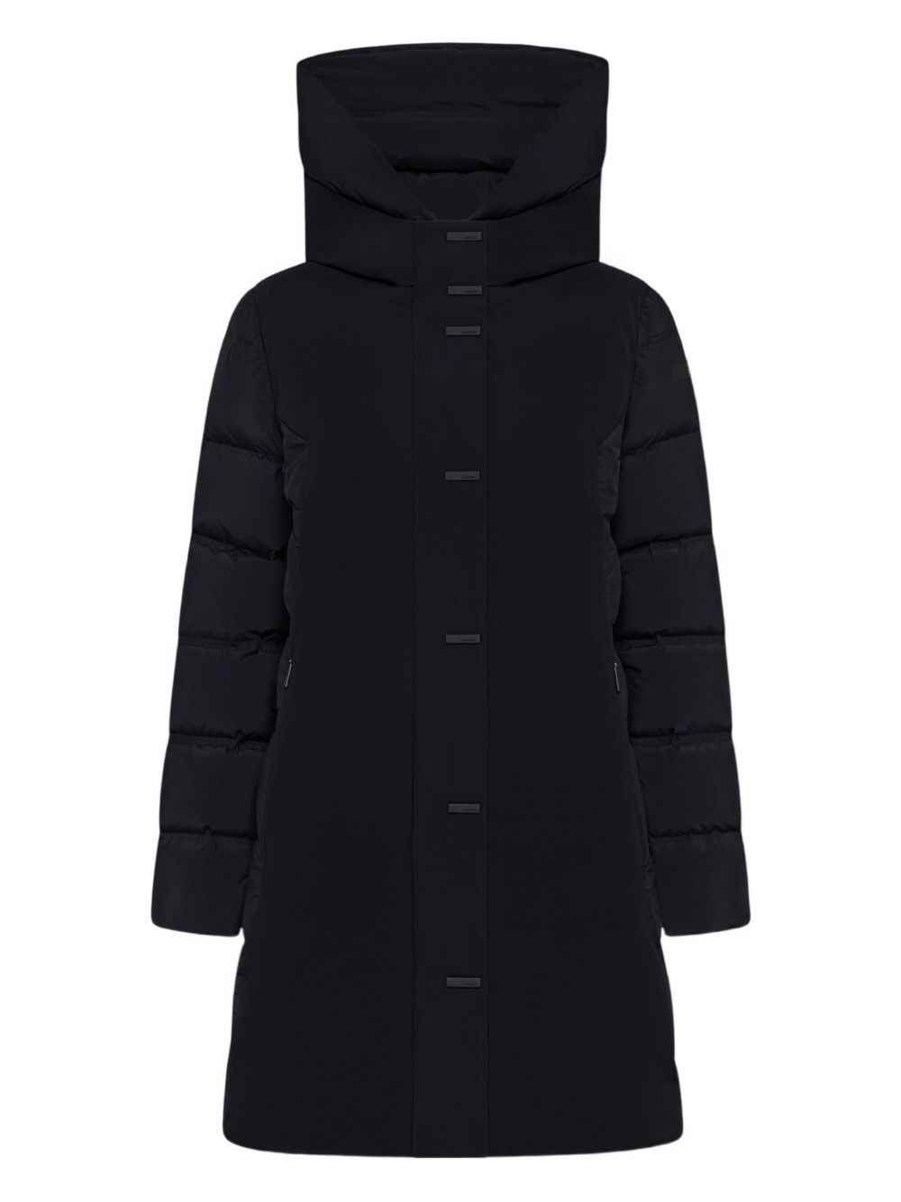 Realizzato in poliammide, traspirante e impermeabile, imbottitura in piuma d'anatra 90/10, collo alto, chiusura frontale con bottoni a barretta satinata e zip termonastrata a doppio cursore sotto, due tasche con chiusura nascosta, cappuccio, applicazione logo a microiniezione sulla manica sinistra, inserti trapuntati, orlo dritto.