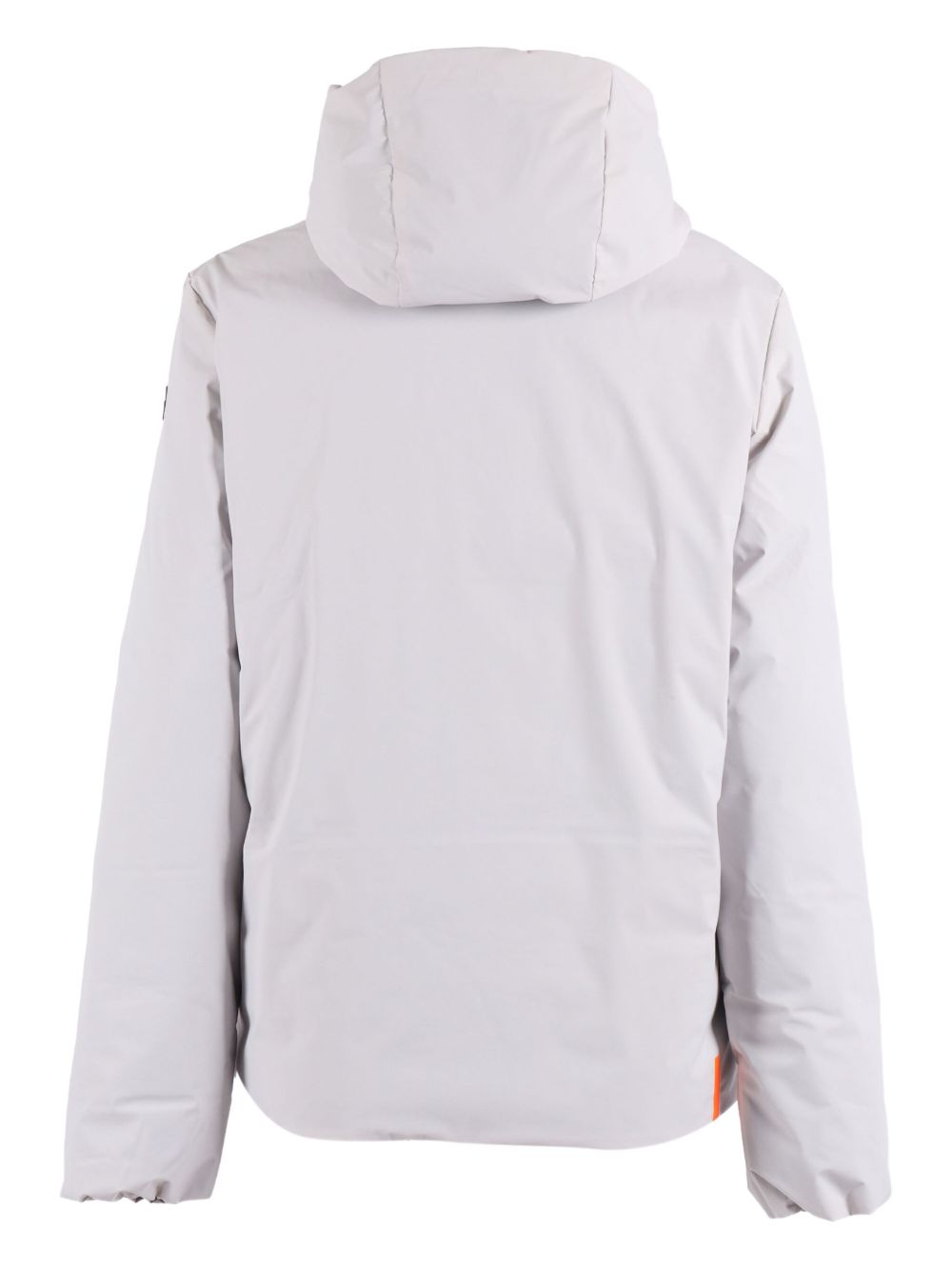 Realizzato in tessuto hi-tech, imbottitura in piuma d'anatra 90/10, chiusura frontale con cerniera termosaldata, due tasche davanti con zip, cappuccio fisso regolabile con coulisse, applicazione logo a microiniezione sulla manica sinistra