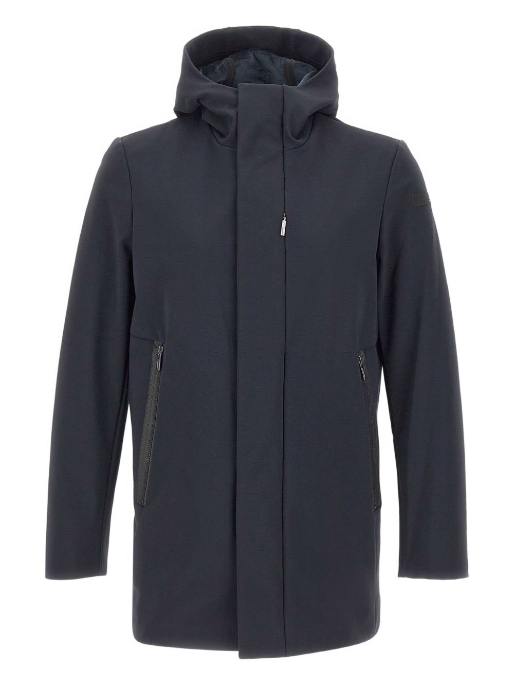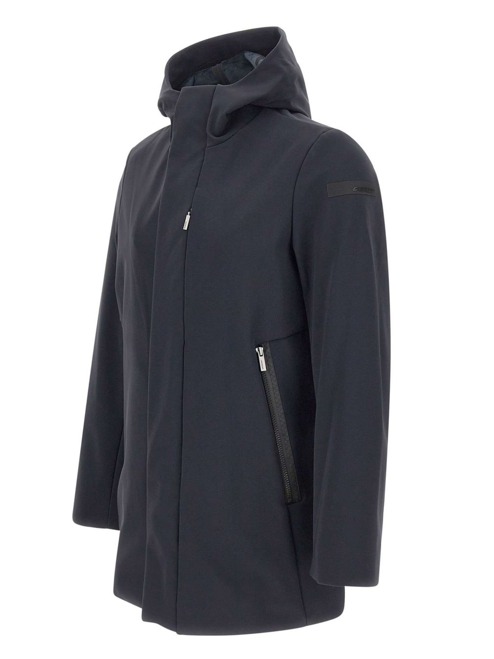 Realizzato in tessuto tecnico Surflex, impermeabile e traspirante, patta frontale con bottoni a pressione e cerniera a doppio cursore nascosta, due tasche davanti con zip termonastrate, cappuccio fisso, applicazione logo a microiniezione sulla manica sinistra, taschino interno con zip nascosta, interno foderato in velluto