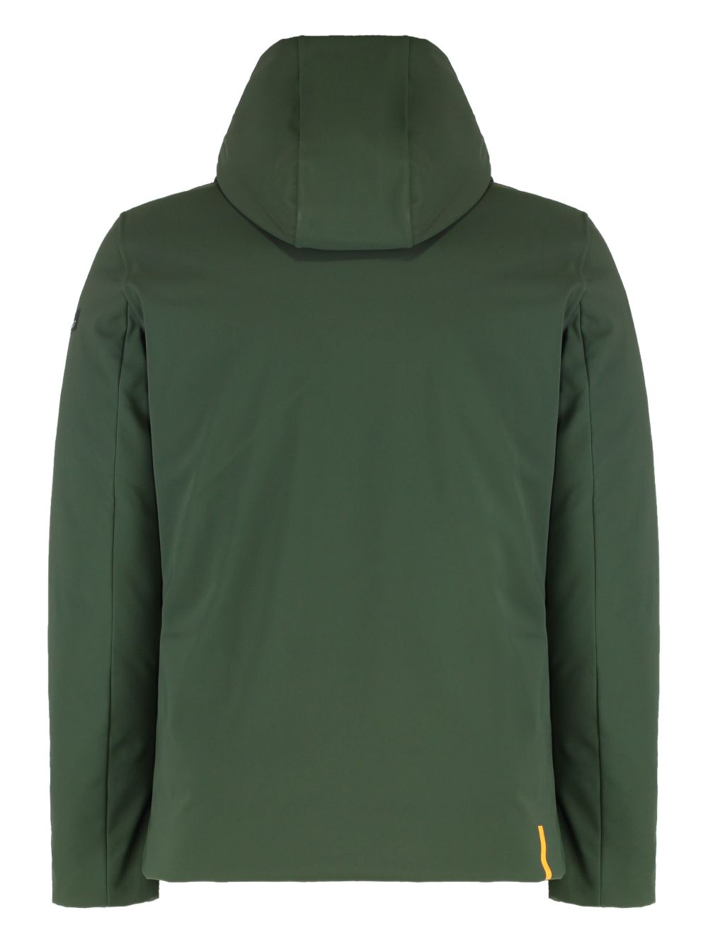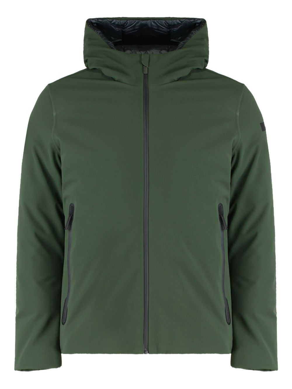 Realizzato in poliammide riciclata e tessuto traspirante e impermeabile, imbottitura in piuma d'anatra 90/10, chiusura frontale con cerniera termosaldata, due tasche davanti con zip, cappuccio, applicazione logo a microiniezione sulla manica sinistra, taschino interno con zip nascosta