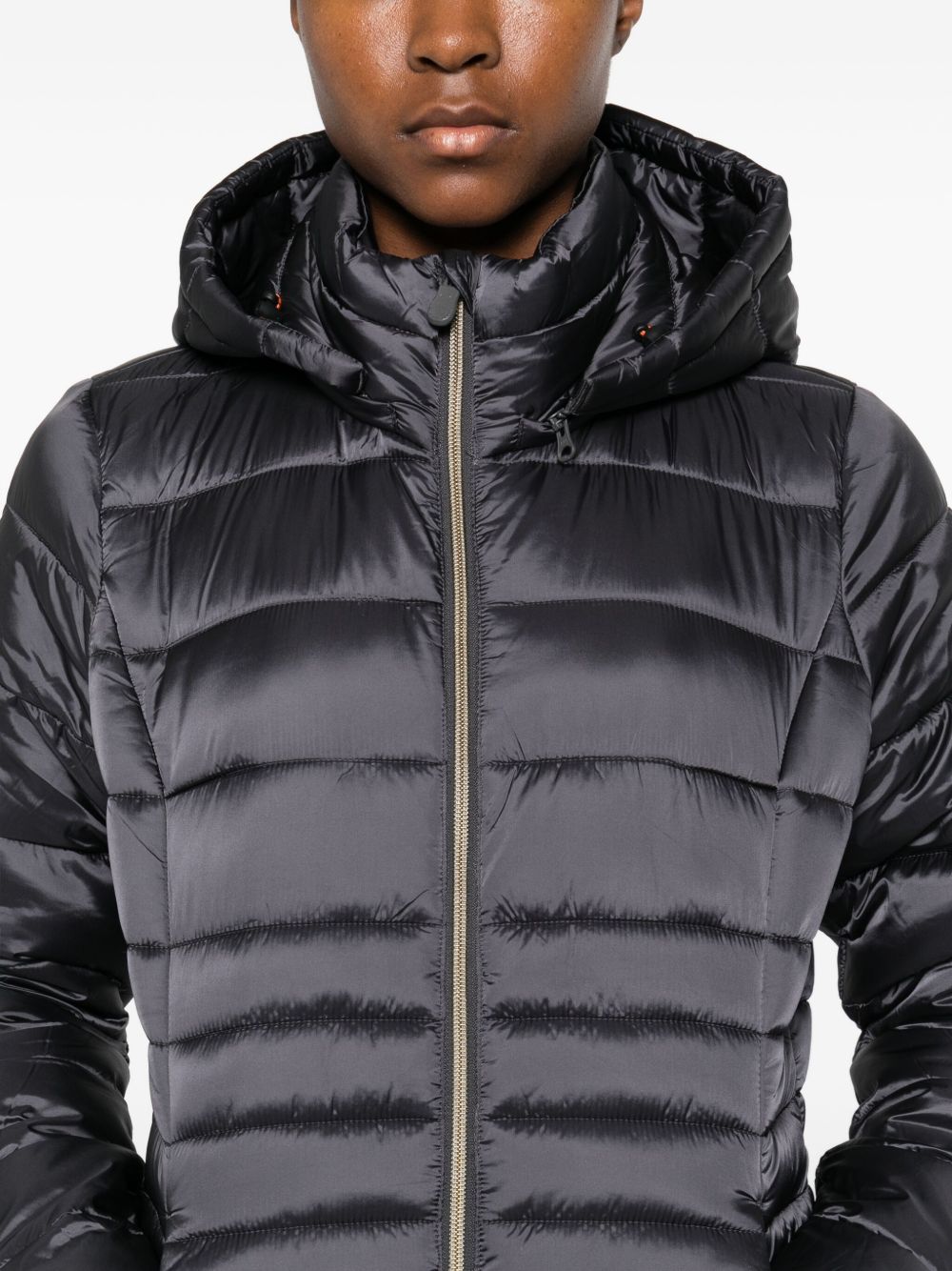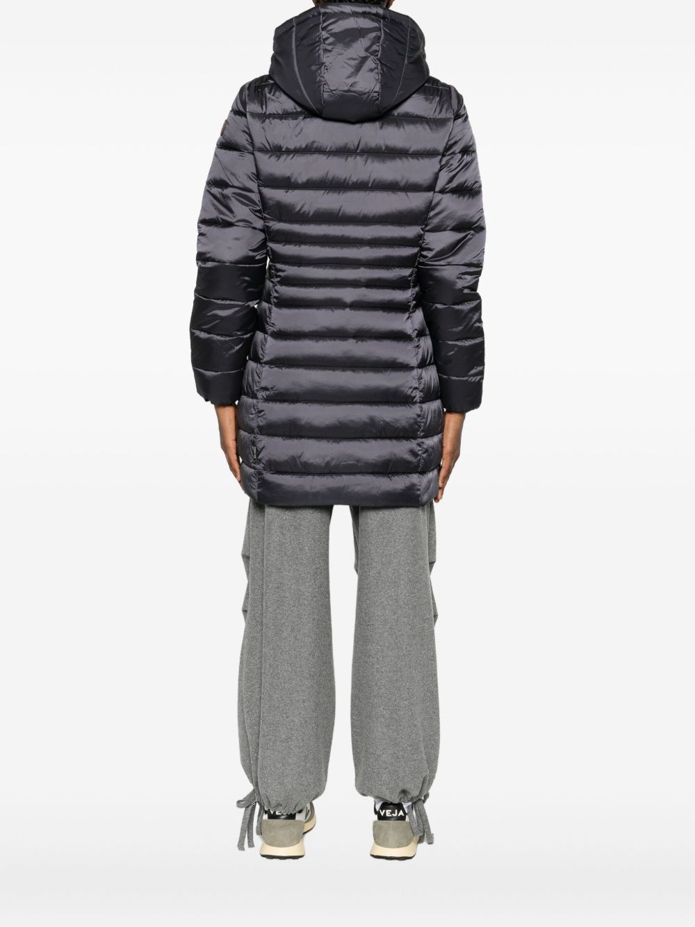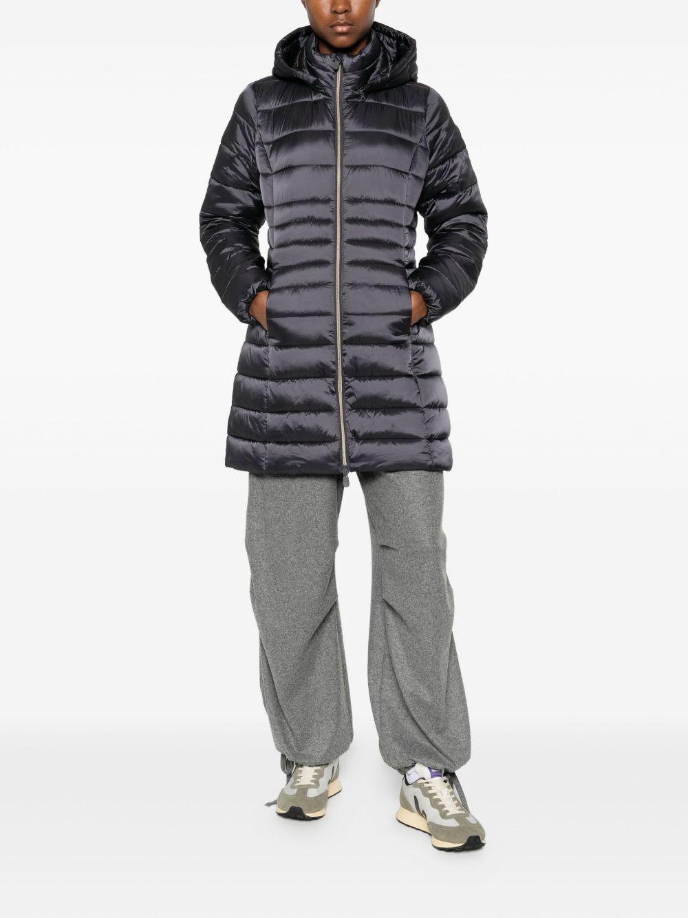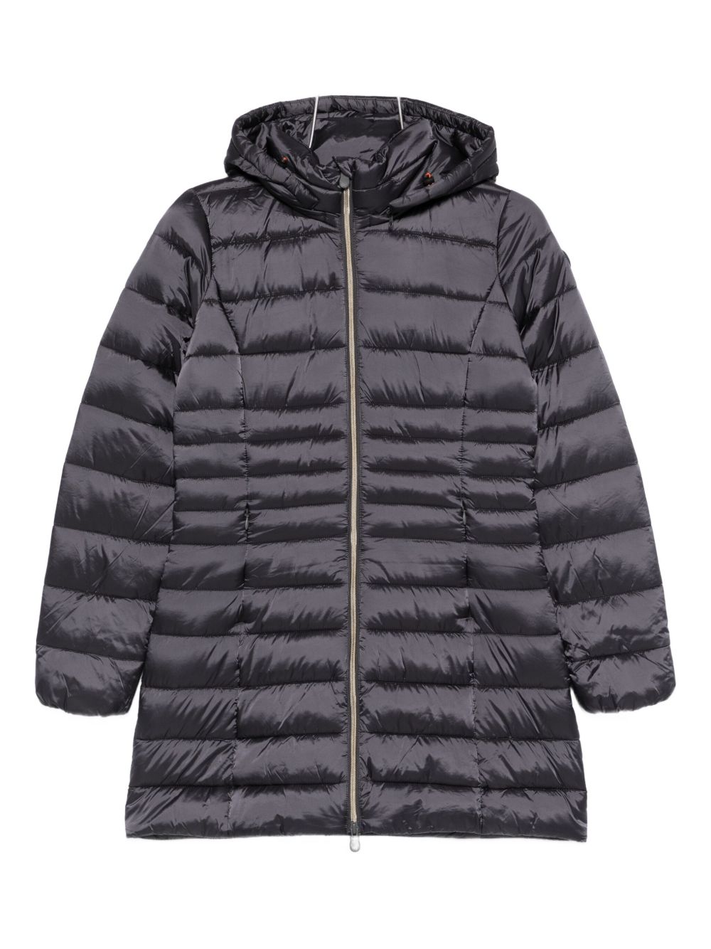 Realizzato in nylon, chiusura frontale a zip, cappuccio, imbottitura orizzontale, 2 tasche davanti con cerniera