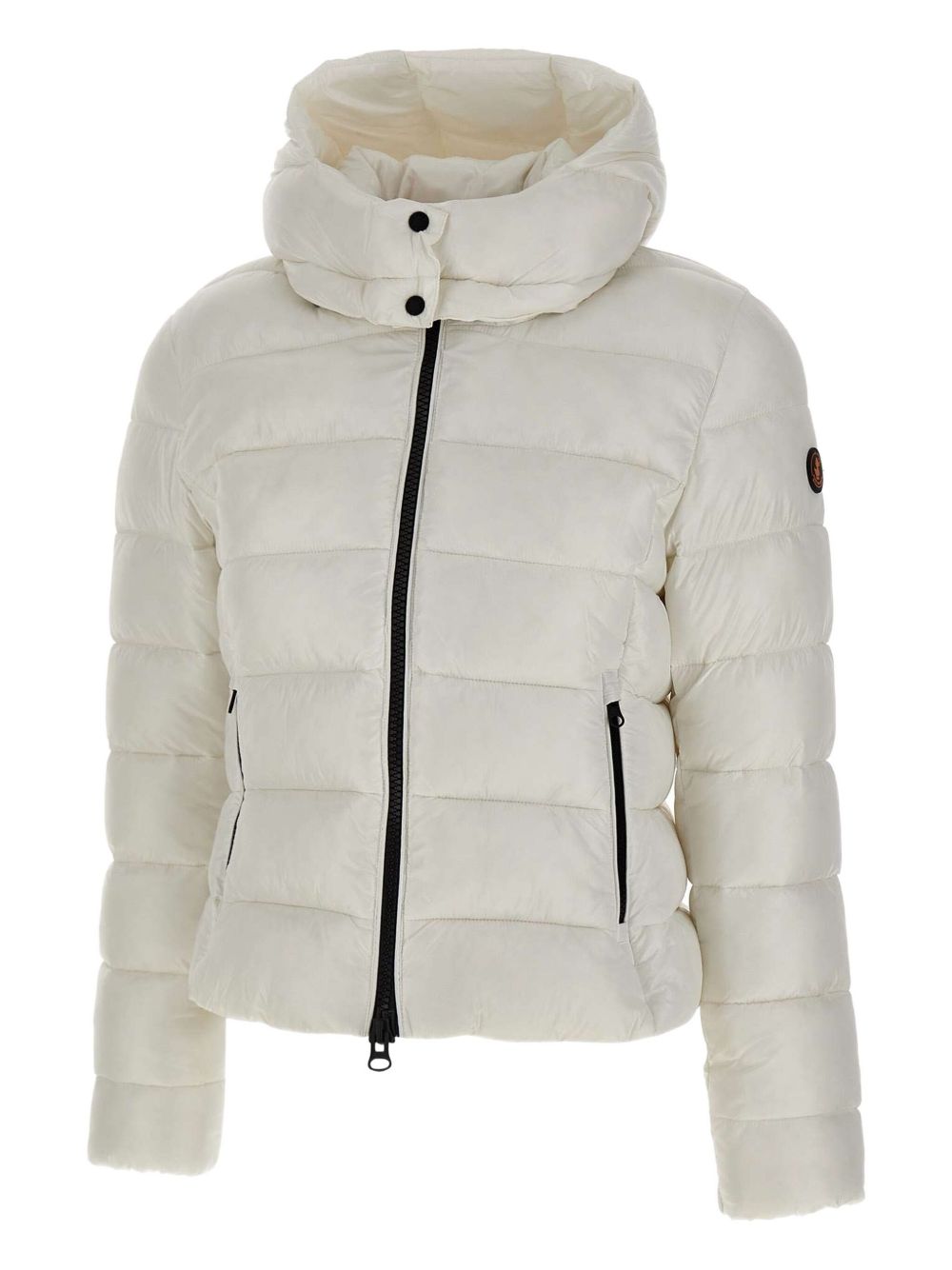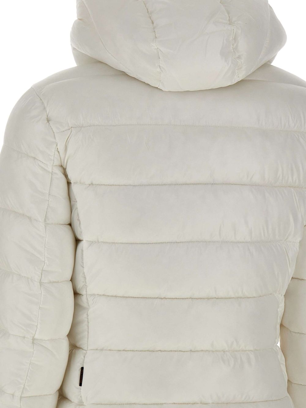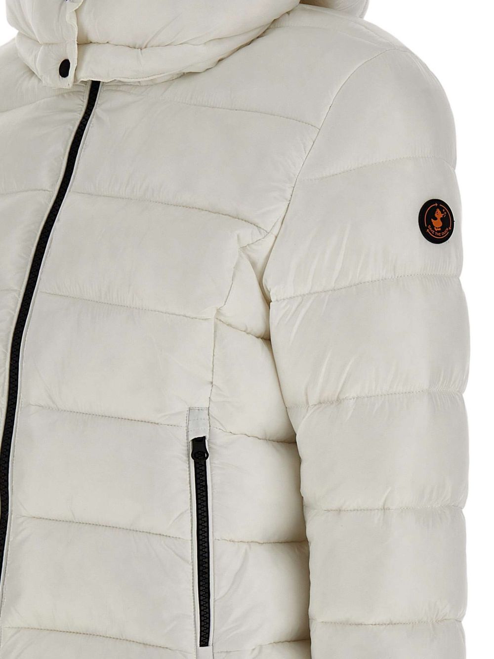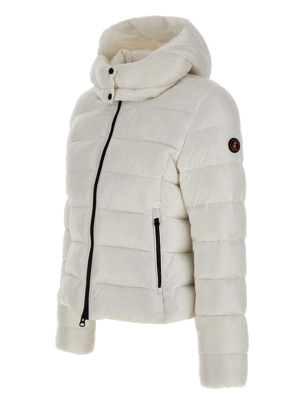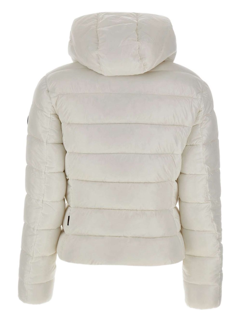 realizzato in nylon riciclato, antivento, cappuccio removibile, polsini con elastico, logo applicato sulla manica, chiusura frontale con zip a doppio cursore, imbottitura morbida