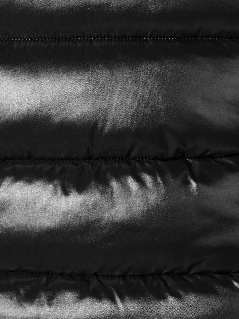 realizzato in tessuto leggero e idrorepellente, finitura lucida, cappuccio, chiusura sul davanti con doppio cursore, due tasche laterali, logo applicato sulla manica, 100% nylon riciclato