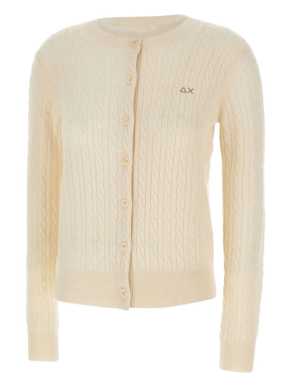 Realizzata in filato di lana e cashmere, lavorazione a trecce, chiusura con bottoni, girocollo, logo ricamato sul petto, 90% lana, 10% cashmere