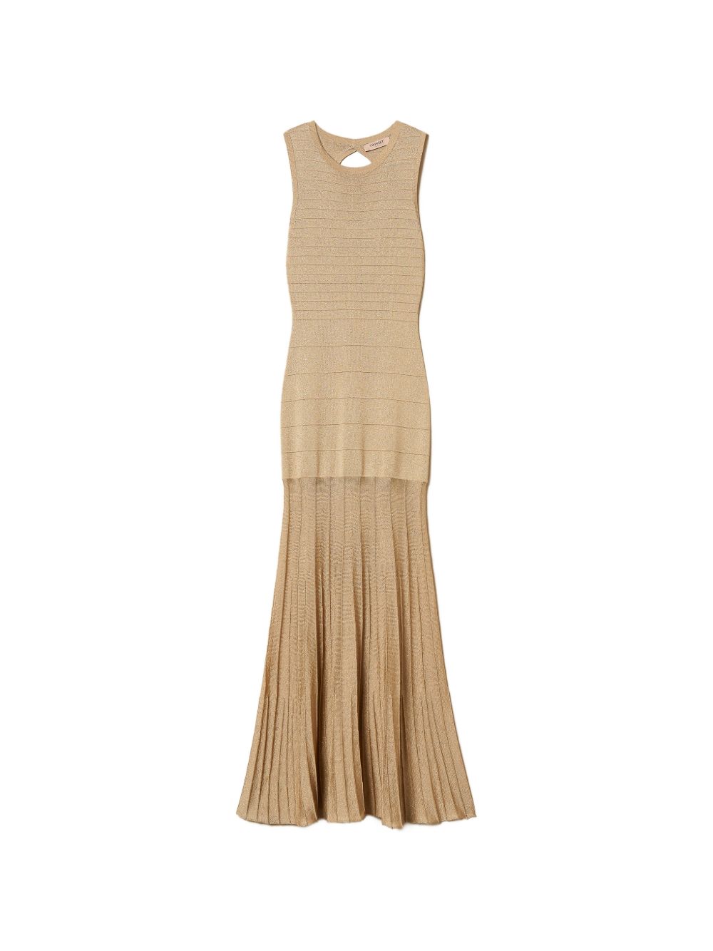 realizzato in filato di misto viscosa con lurex, collo rotondo, piccola apertura sul retro, gonna ampia con righe verticali, linea fitted e morbida sul fondo, 77% viscosa, 12% poliestere metallizzato, 11% poliammide