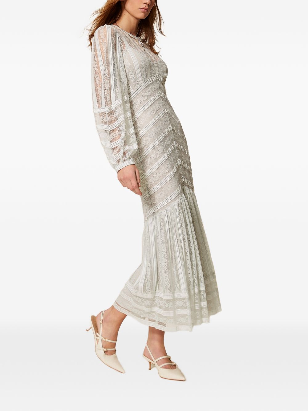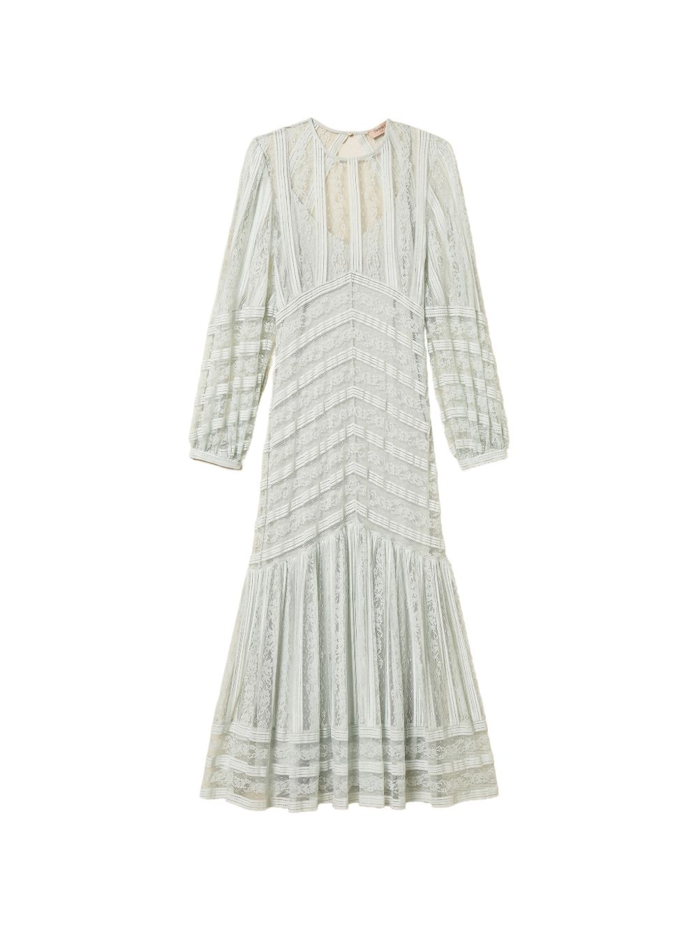 realizzato in pizzo dal disegno verticale, scollo rotondo, maniche lunghe con balza arricciata sul fondo, chiusura con zip, apertura sulla schiena, sottoveste removibile in crepe de chine, design slim