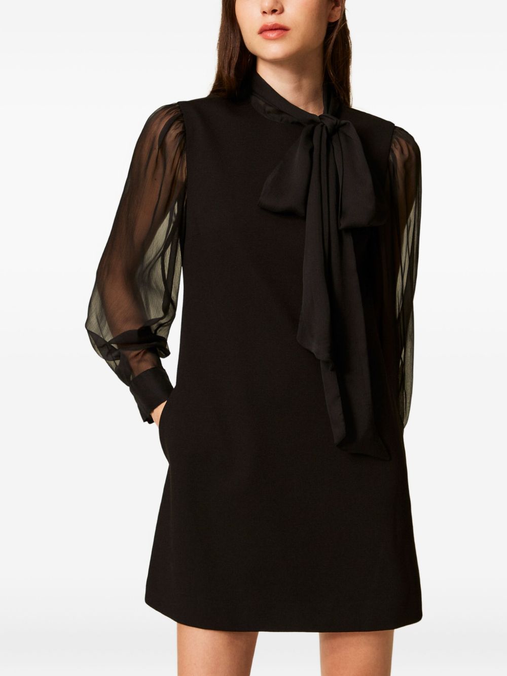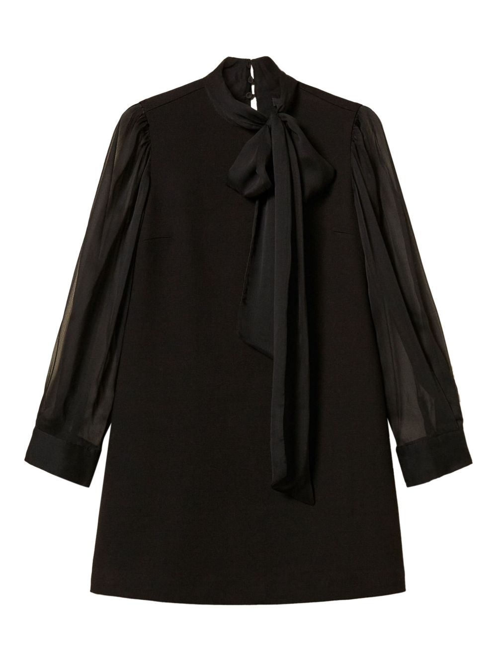 realizzato in punto Milano, maniche in voile, collo alto con fusciacca annodabile a fiocco, chiusura a goccia sul retro ed ampia apertura sulla schiena, linea svasata, fodera interna, 70% viscosa, 25% poliammide, 5% elastan