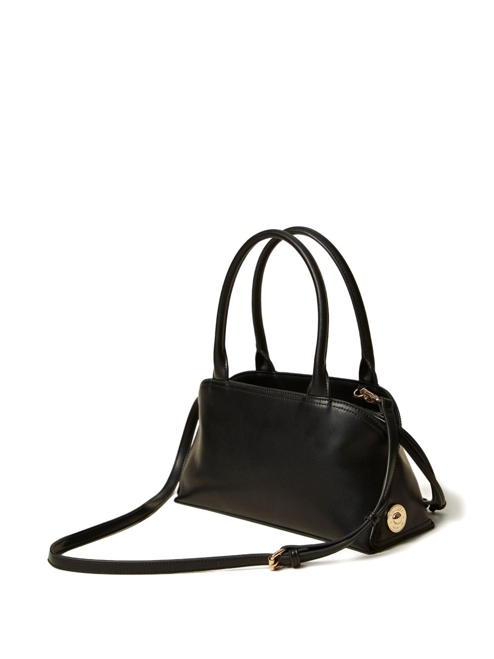 Realizzata in poliuretanica, effetto pelle liscia, tracolla removibile e regolabile, logo in metallo color oro davanti, doppio manico superiore, larghezza 32 cm, altezza 16,5 cm, profondità 12 cm.