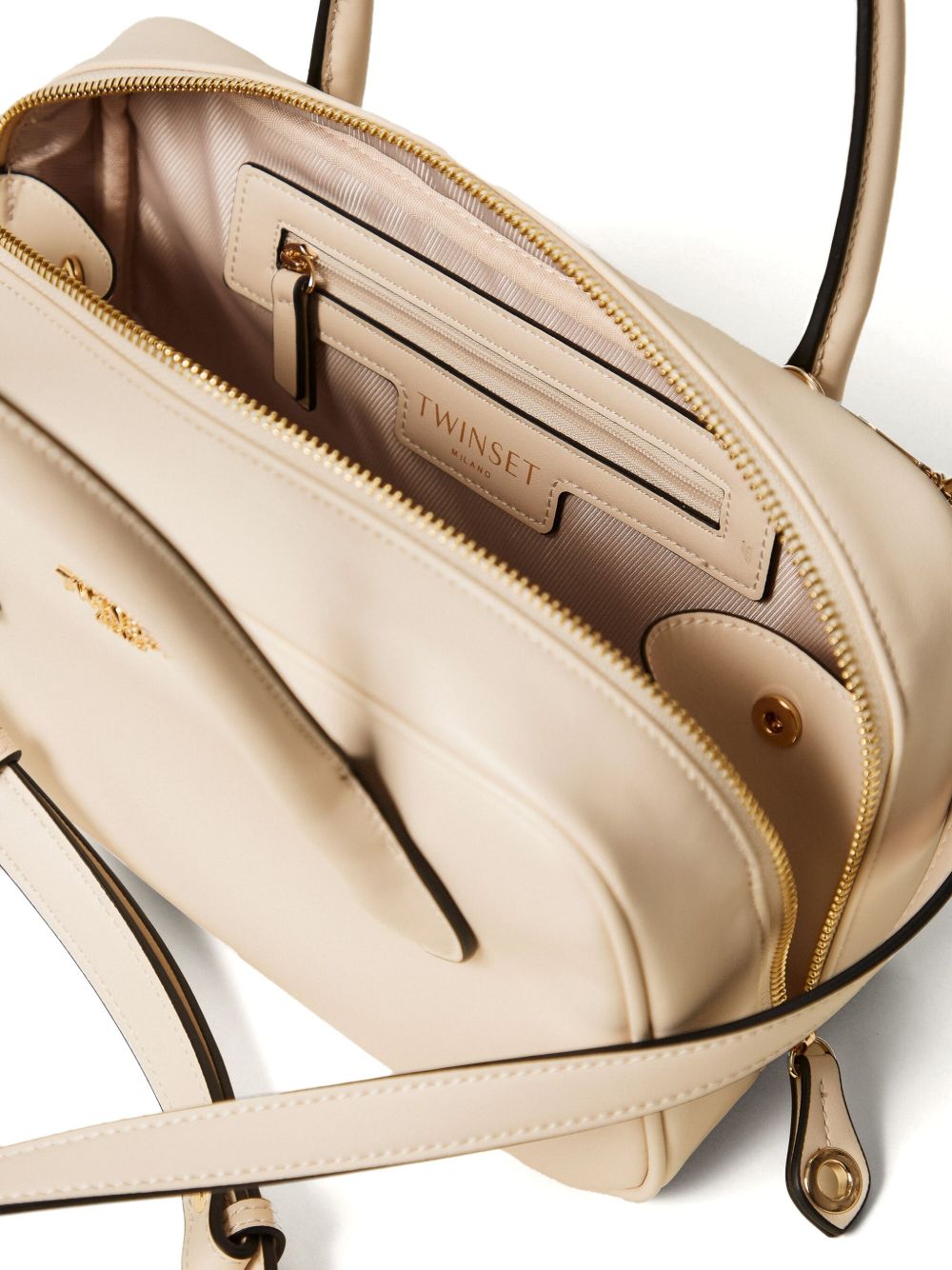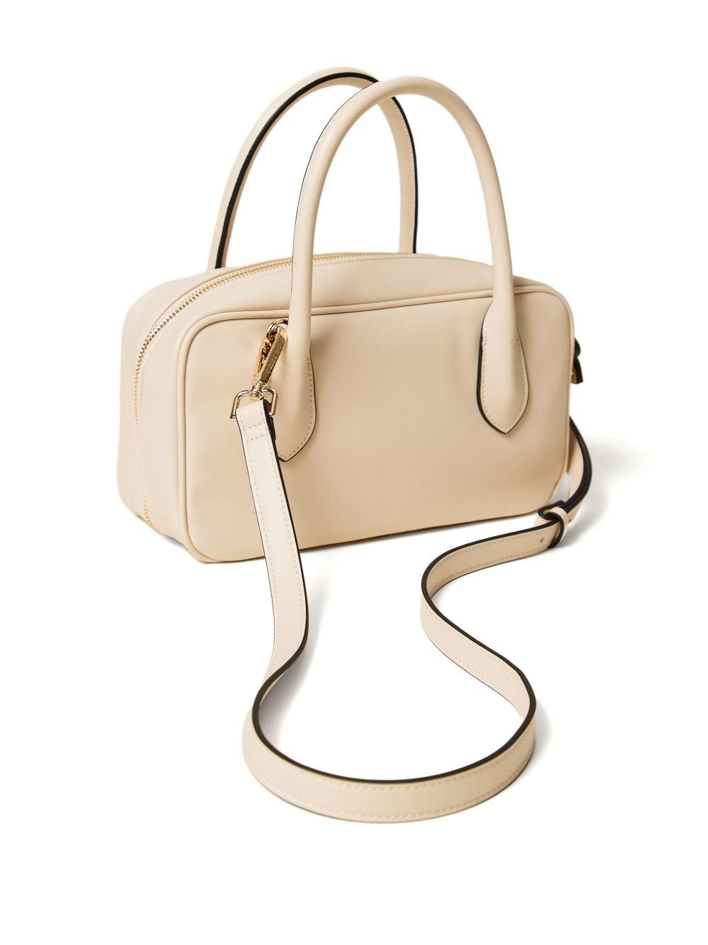 realizzata in pelle sintetica di alta qualità, logo lettering frontale in metallo color oro, chiusura superiore a zip, tasca interna con cerniera, larghezza 27,5 cm, altezza 15 cm, profondità 10 cm