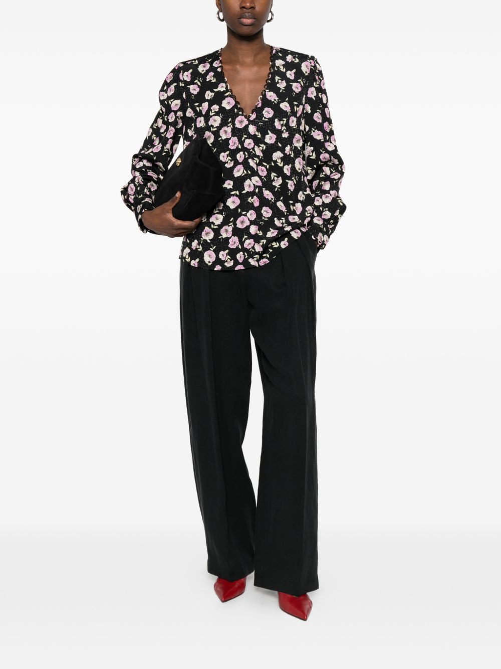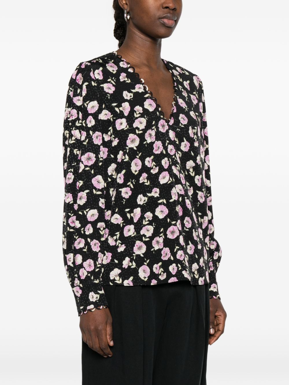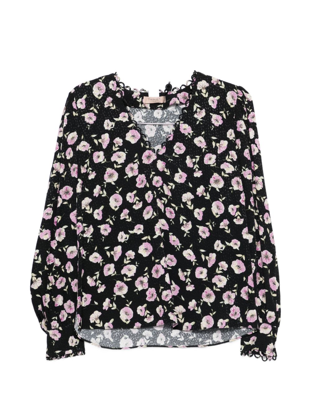 realizzata in microviscosa, stampa floreale, scollo a V, maniche lunghe, piccolo logo metallico applicato sul retro