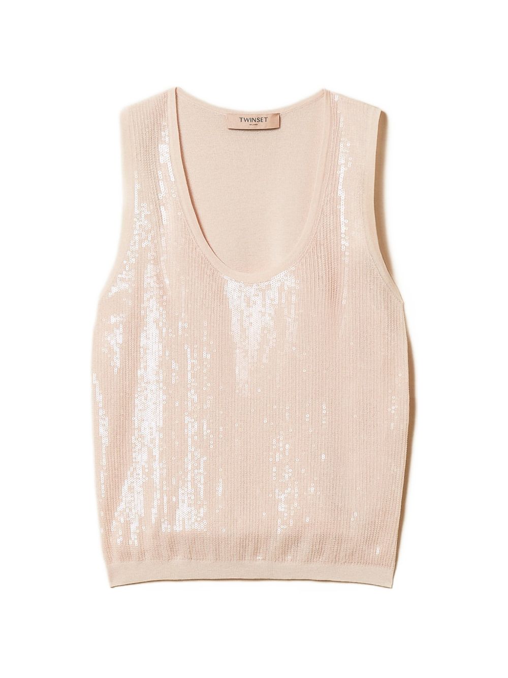 Realizzata in misto cotone, applicazione paillettes, scollo a barca, senza maniche, 82% cotone, 18% poliammide