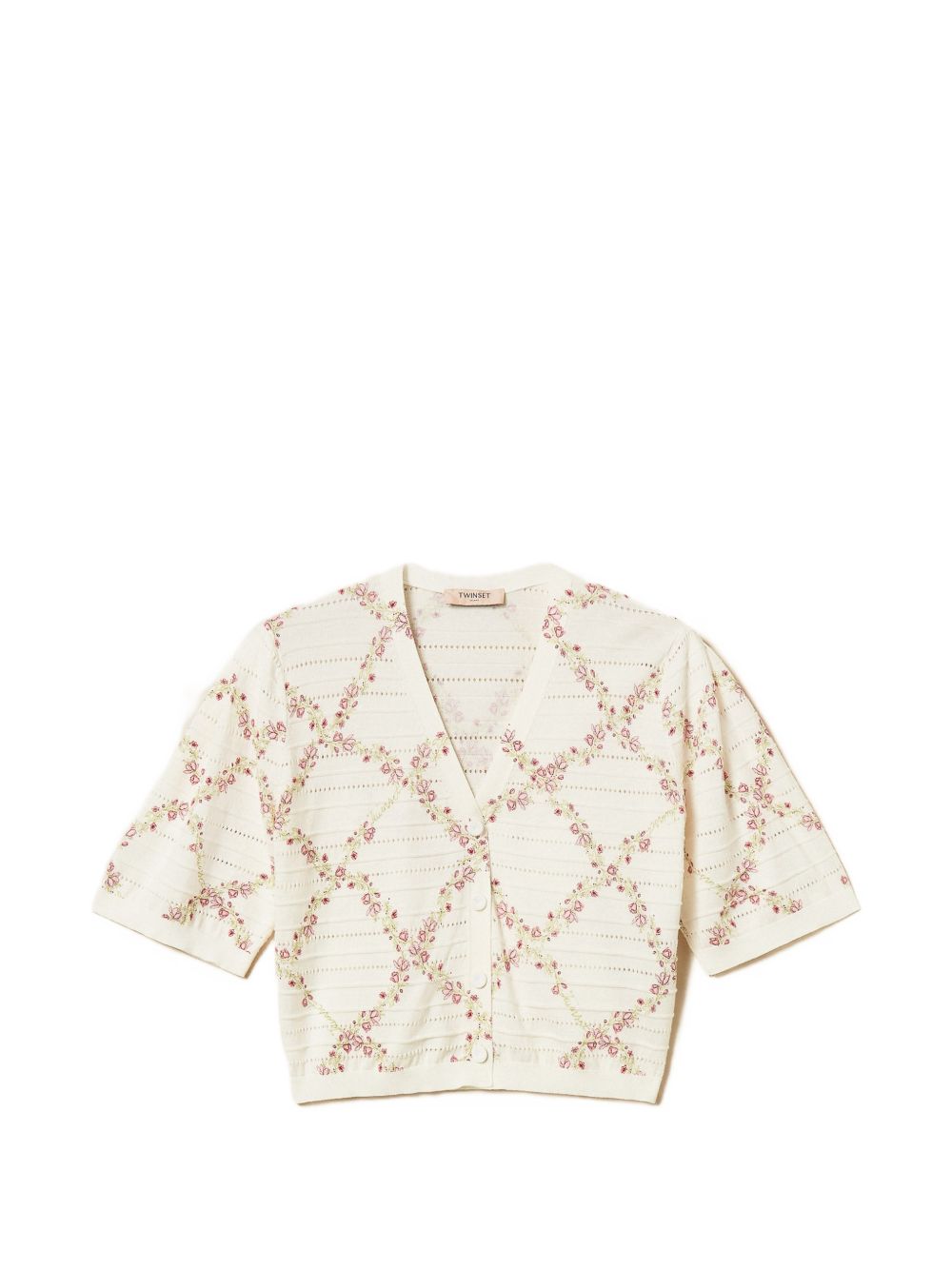Realizzata in cotone con lavorazine a maglia, scollo a V, stampa ciliege all-over, mezza manica, chiusura con bottoni, taglio crop, 100% cotone