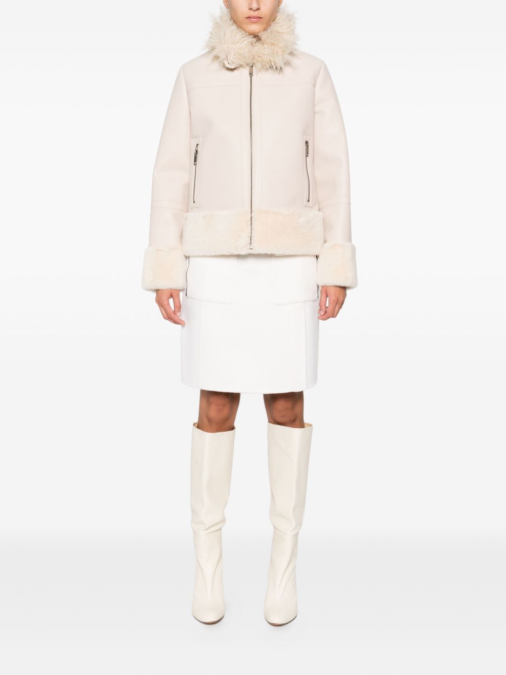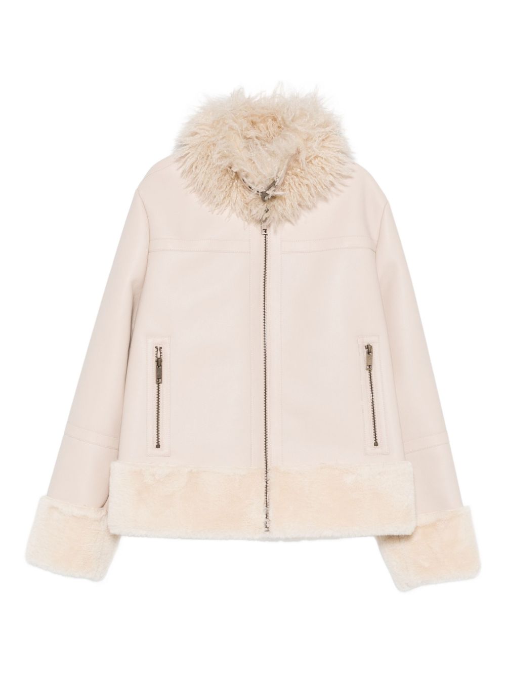 realizzata in ecopelle e pelliccia sintetica di alta qualità, color beige, interno delicatamente imbottito per comfort termico ideale, chiusura con zip, tasche chiuse, pelle sintetica 100%, pelliccia sintetica 100%, poliestere 100%