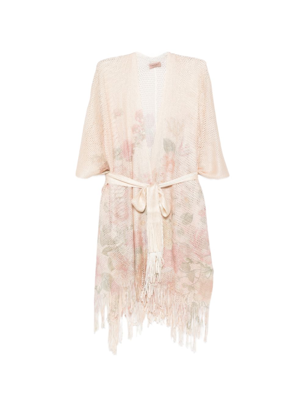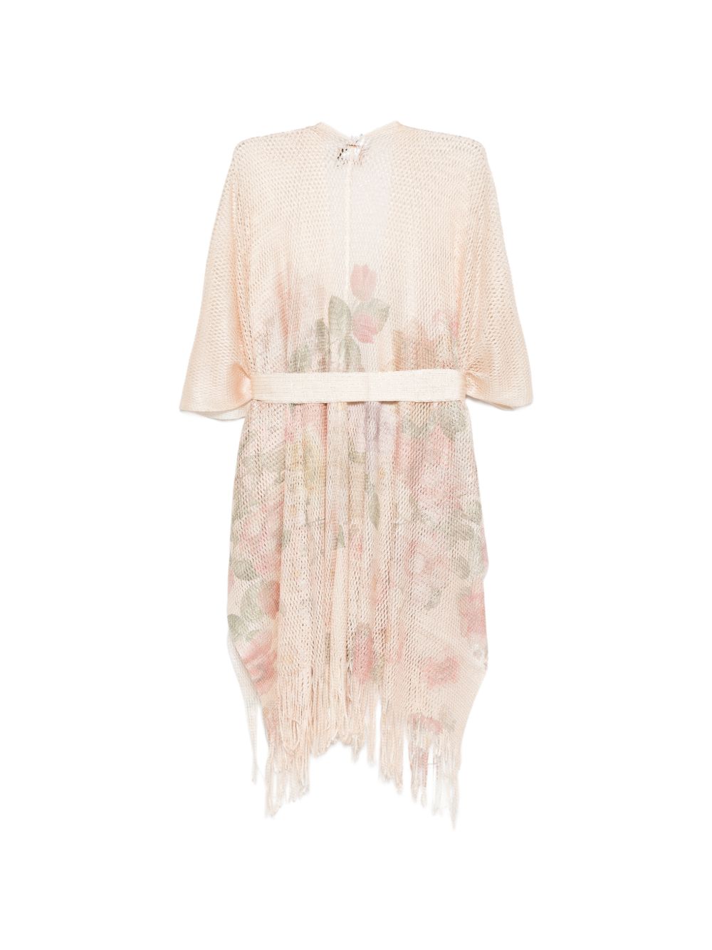 Realizzato in tessuto trasparente, stampa floreale, frange in fondo, cintura con nodo in vita, mezza manica, 100% tessuto