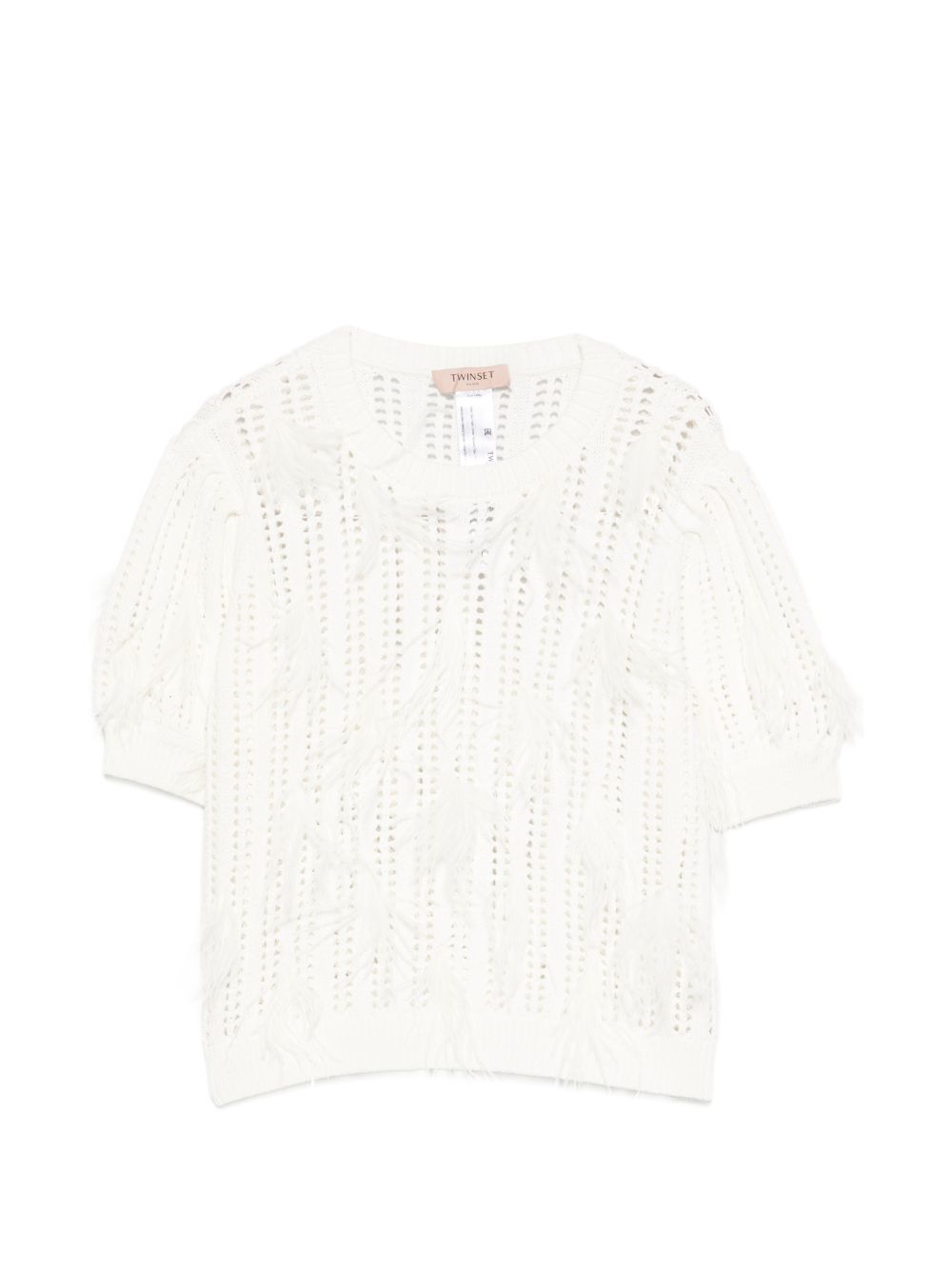 Realizzata in misto cotone con lavorazione a punto aperto, girocollo, mezza manica, dettaglio frange in piume, 100% piuma di struzzo, 60% cotone, 40% viscosa
