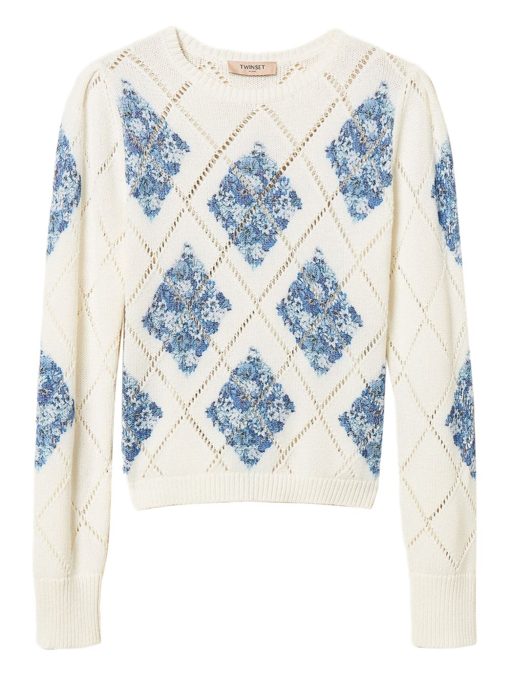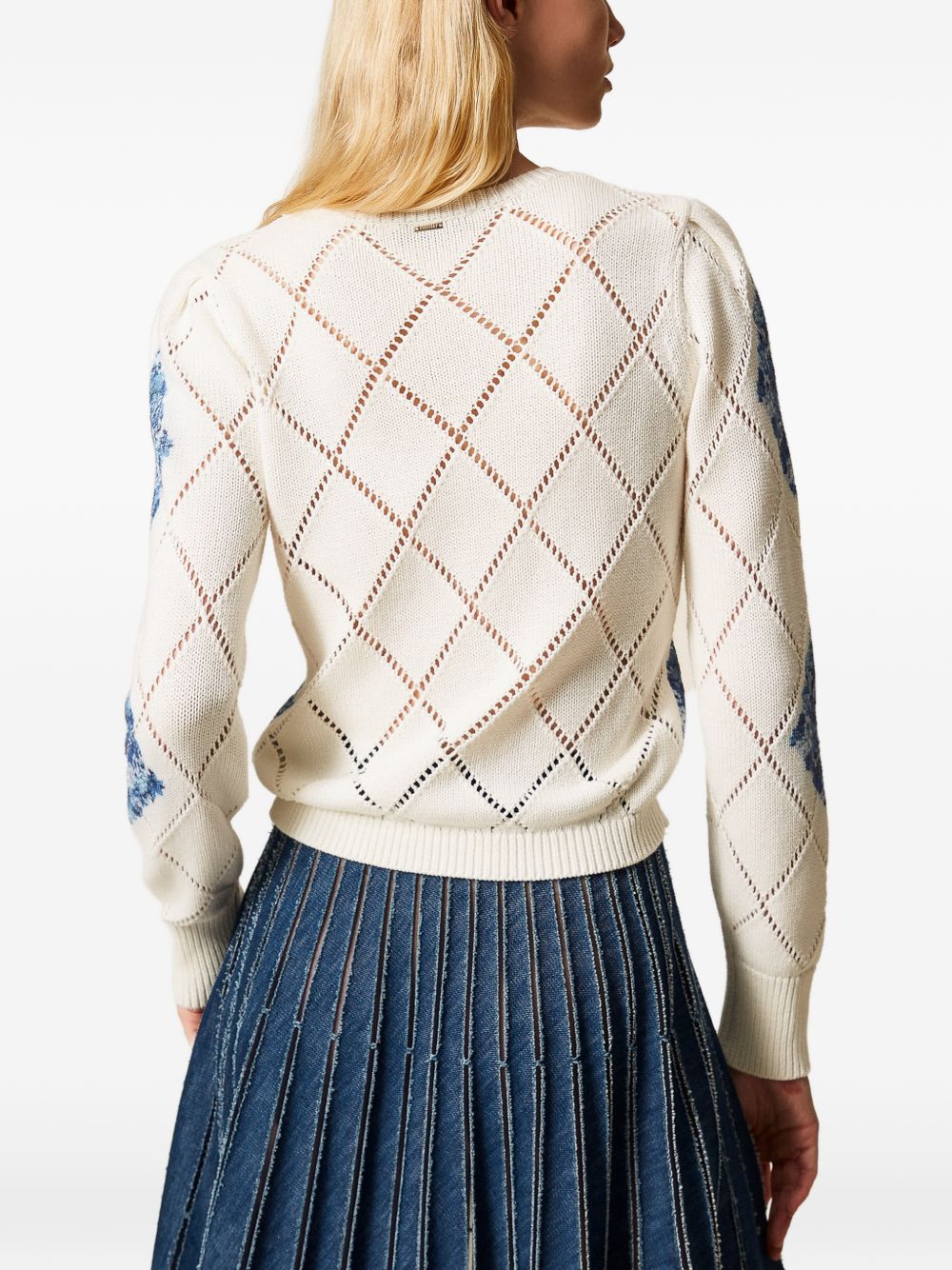 Realizzata in cotone con lavorazione a punto aperto, motivo a rombi con fiori, scollo rotondo, maniche lunghe, 100% cotone