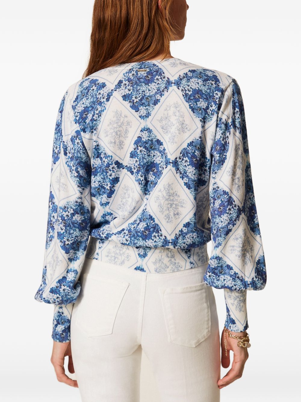 Realizzata in cotone, motivo a rombi con fiori, scollo a V, maniche lunghe, 100% cotone
