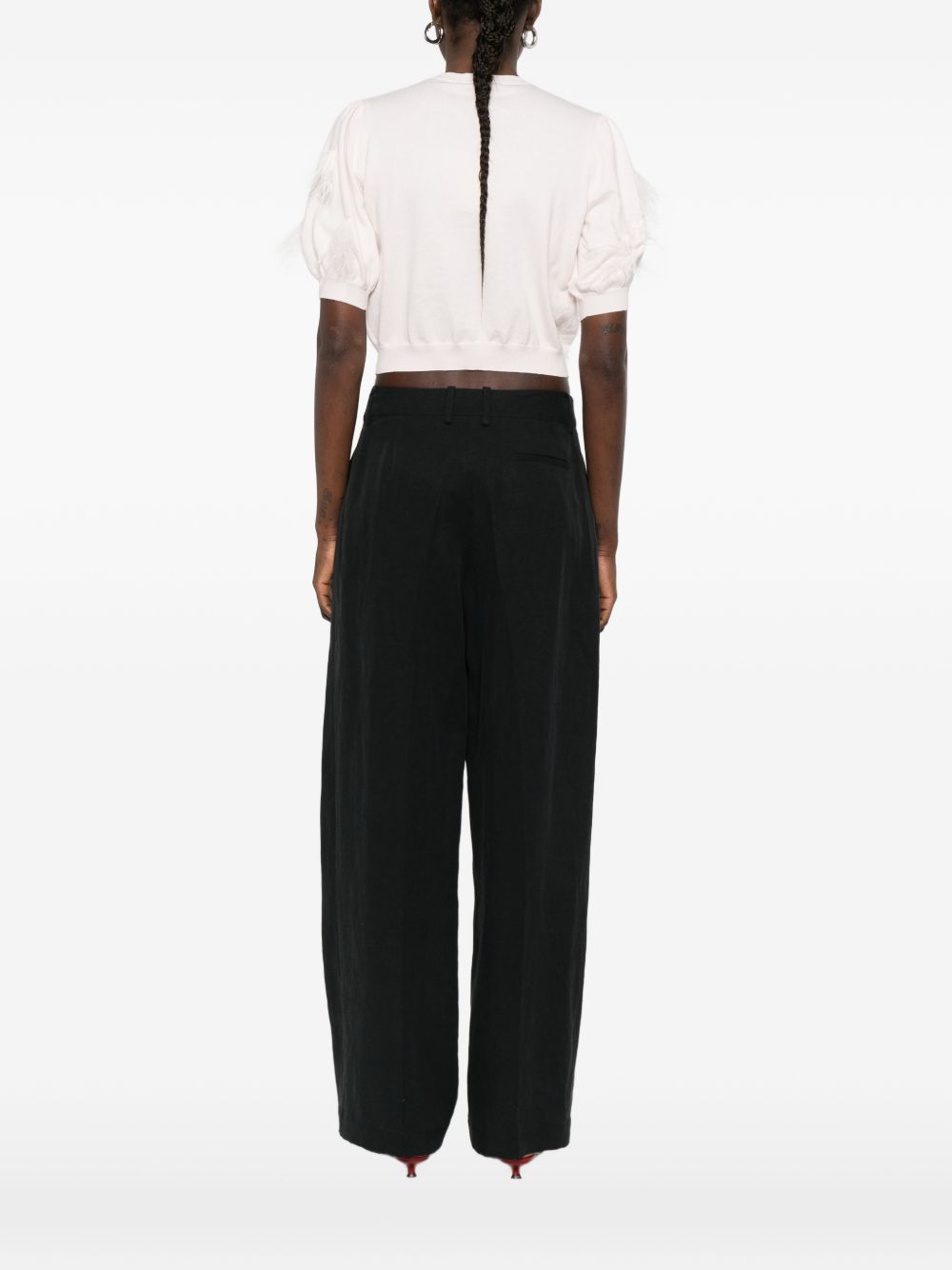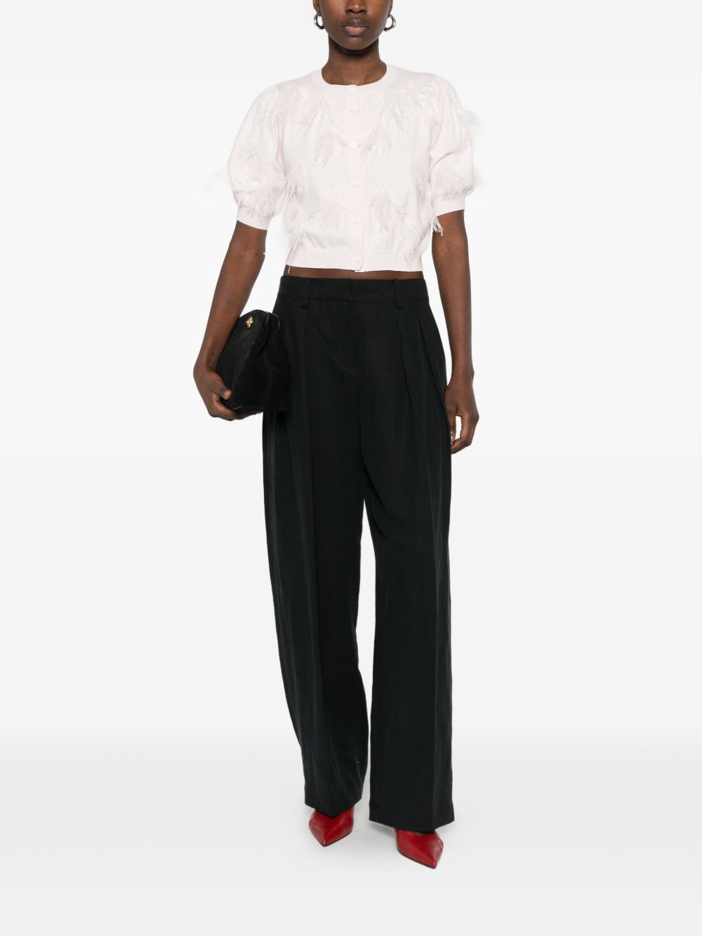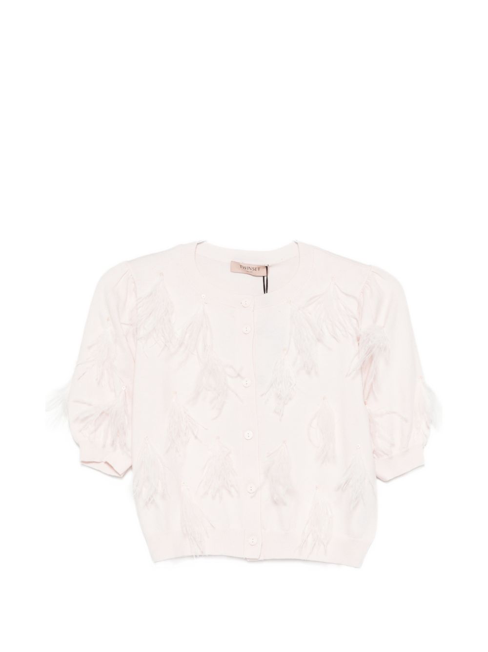 Realizzata in misto cotone, chiusura con abbottonatura davanti, scollo rotondo, mezza manica, dettaglio frange con piume, design croppato, 100% piume di struzzo, 95% cotone, 5% cashemere