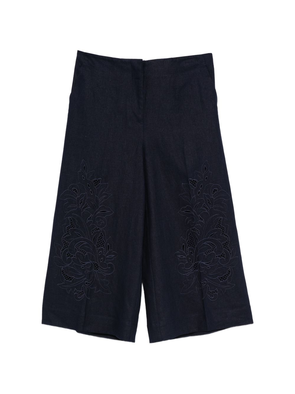 realizzato in misto lino e viscosa, dettaglio con ricamo floreale sul davanti, tasche sui fianchi, piega stirata, linea ampia, 55% lino, 45% viscosa