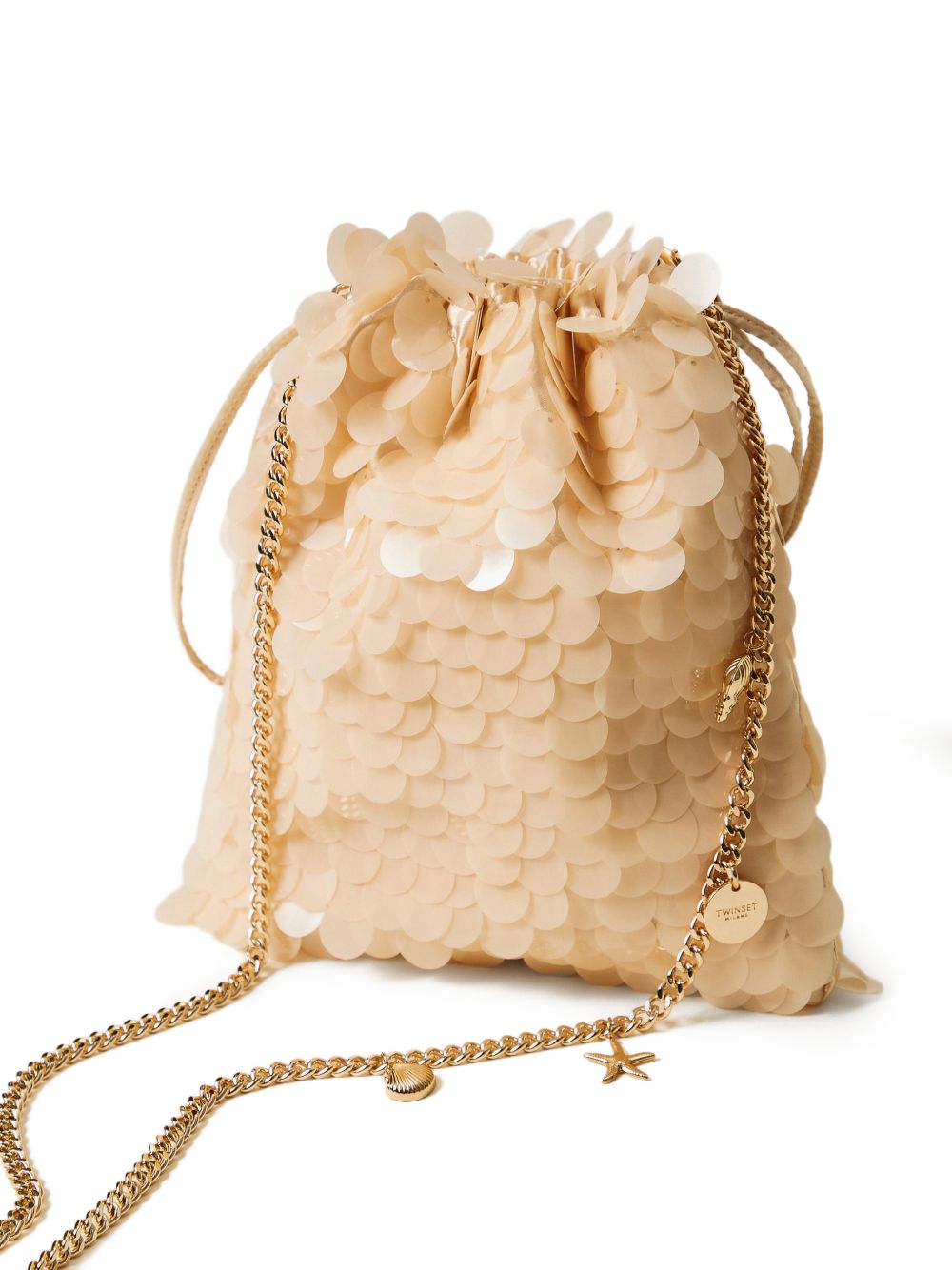 design a sacchetto, realizzata in raso lucido ricoperto con ricamo di maxi paillettes in tinta, chiusura con coulisse, tracolla removibile a catena color oro con charms applicati lunga 50 cm, lunghezza 21 cm, altezza 23 cm