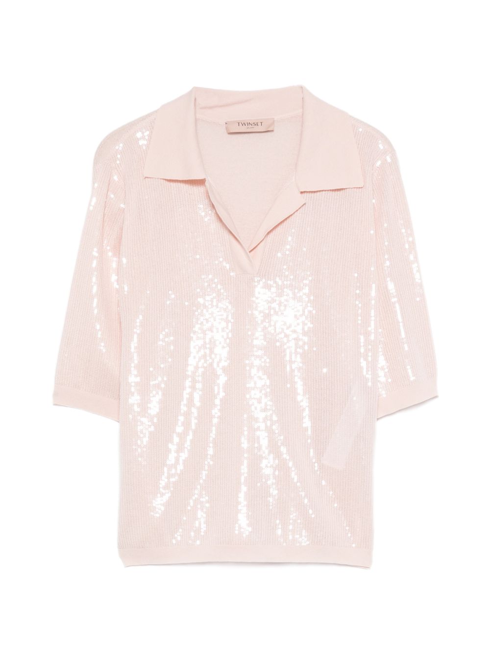 Realizzata in misto cotone, applicazione paillettes, scollo a V, colletto classico polo, mezza manica, 82% cotone, 18% poliammide