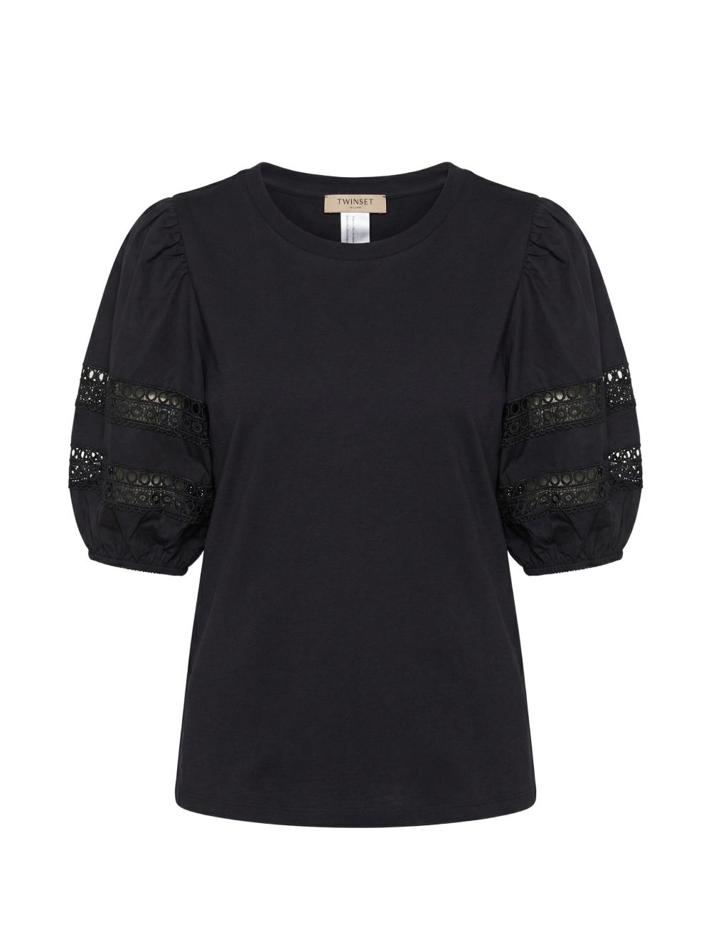 Realizzata in cotone, girocollo, mezza manica a palloncino con dettagli in pizzo, 100% cotone
