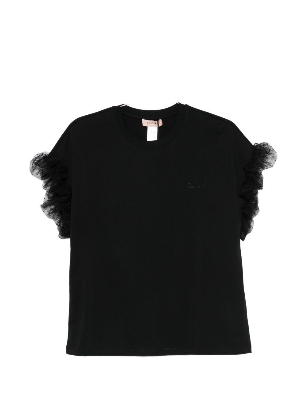 Realizzata in cotone, girocollo, maniche corte con ruches, 100% cotone