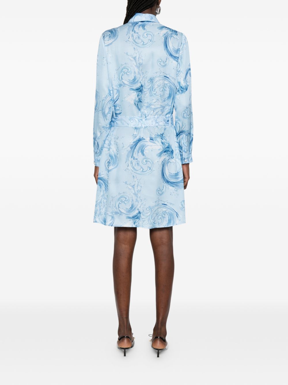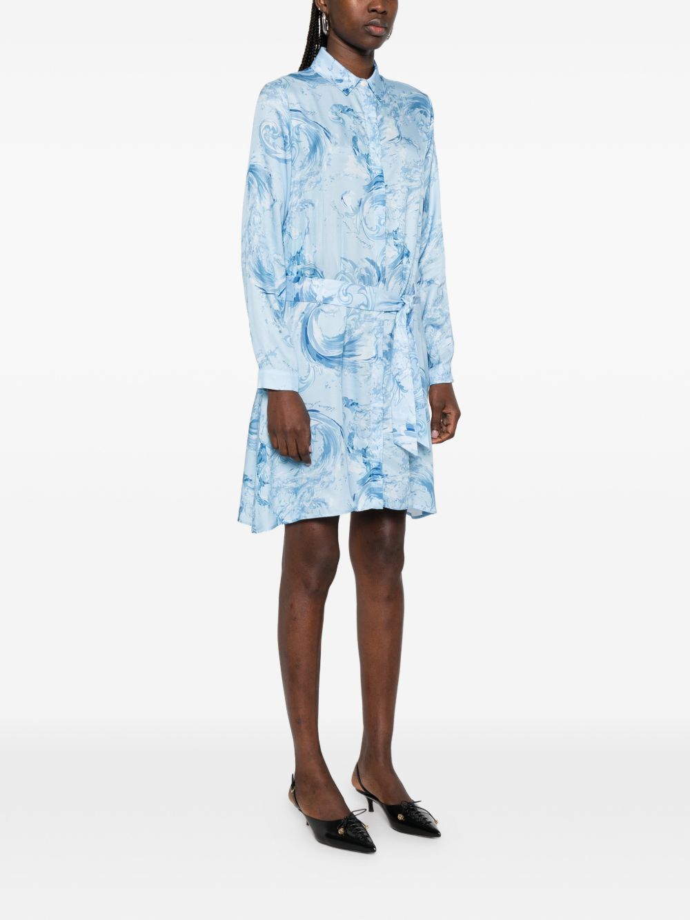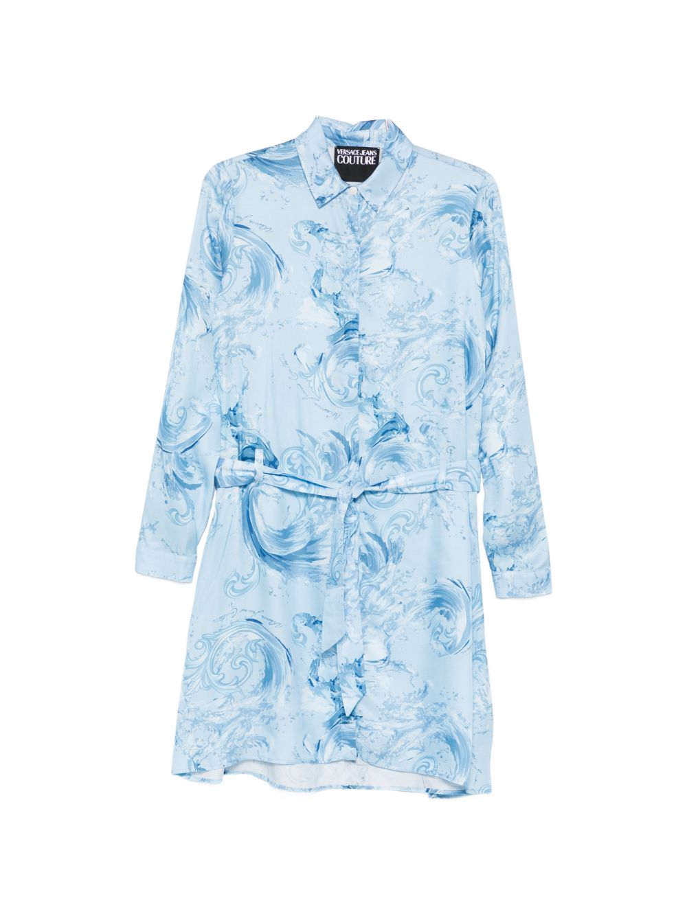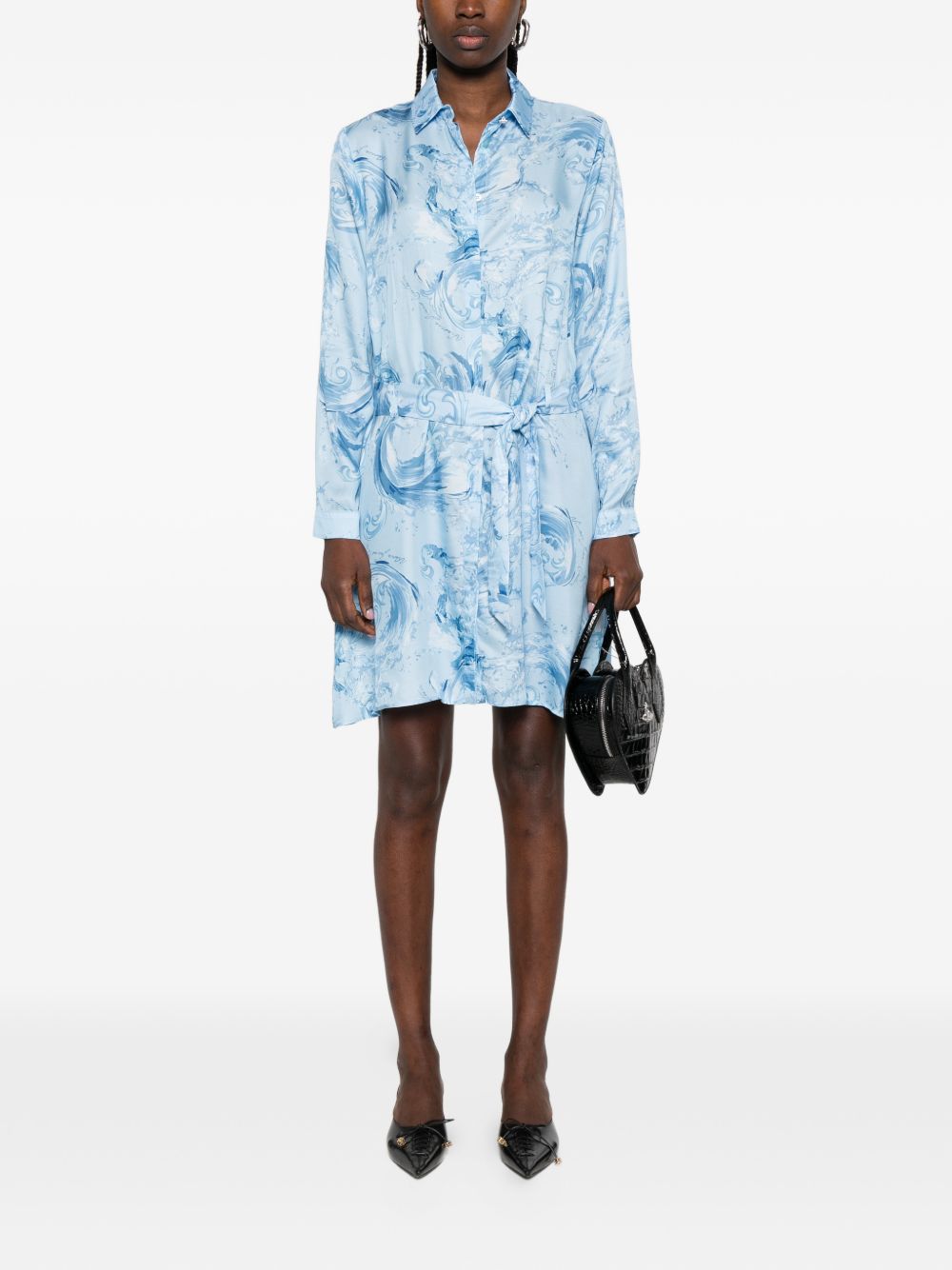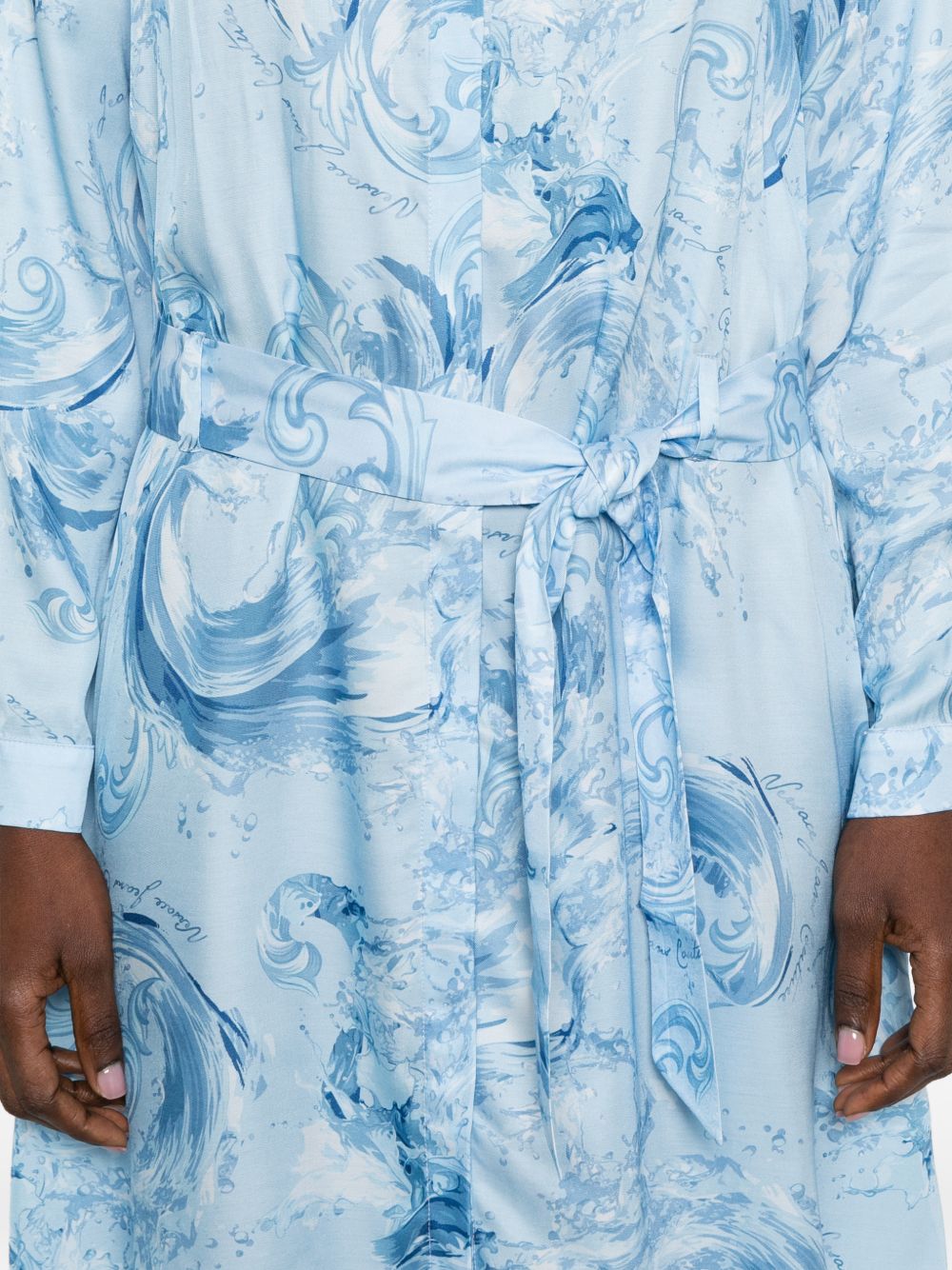 Realizzato in viscosa, design fantasia, nodo in vita, chiusura frontale con bottoni, colletto, maniche lunghe, 100% viscosa