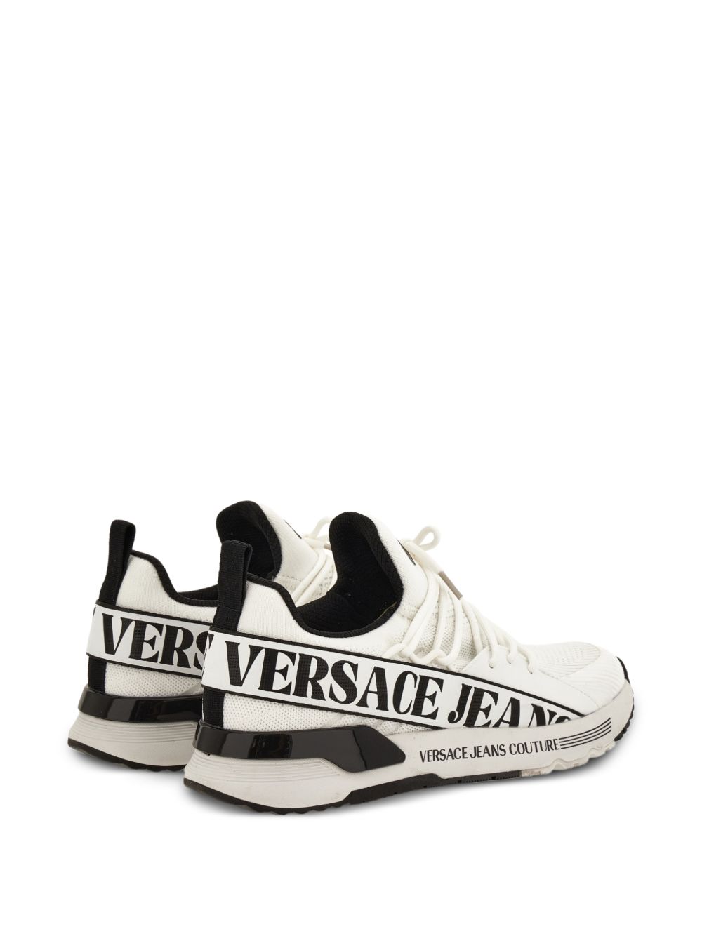realizzata in tessuto, fascia logata, chiusura frontale con lacci a coulisse, suola in gomma logata