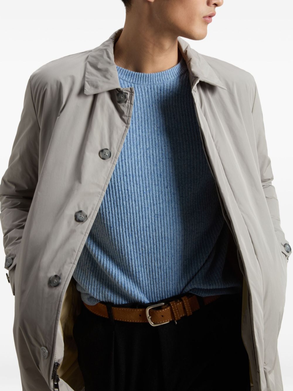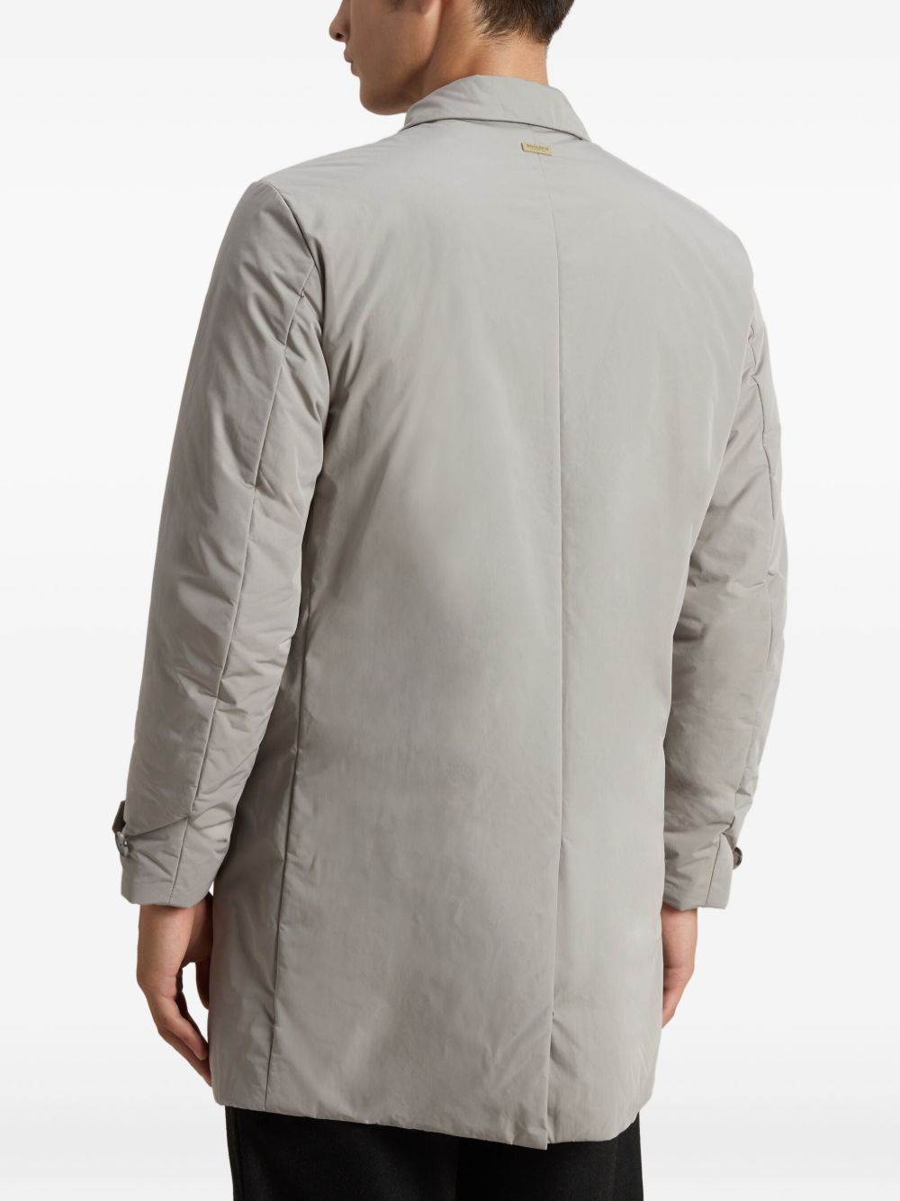 Realizzato in tessuto Urban Touch, chiusura frontale con bottoni e zip, due tasche davanti a filetto e bottoni interni, tasca interna con cerniera, polsini regolabili a spacco con bottone, targhetta in metallo logata sul retro.