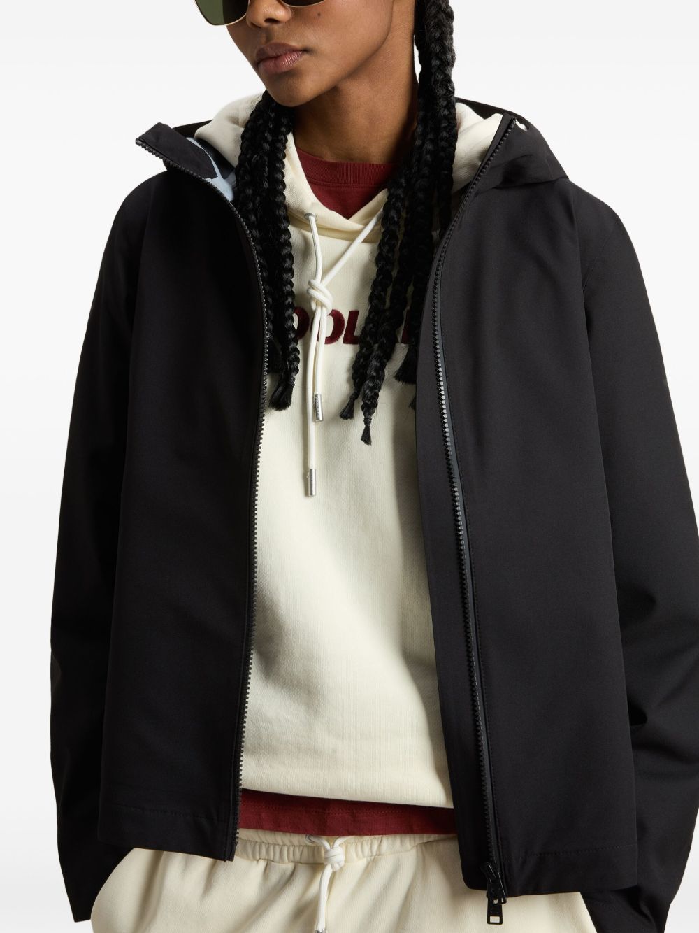 Realizzata in poliestere, chiusura con zip, cappuccio, due tasche frontali a filetto, 100% poliestere