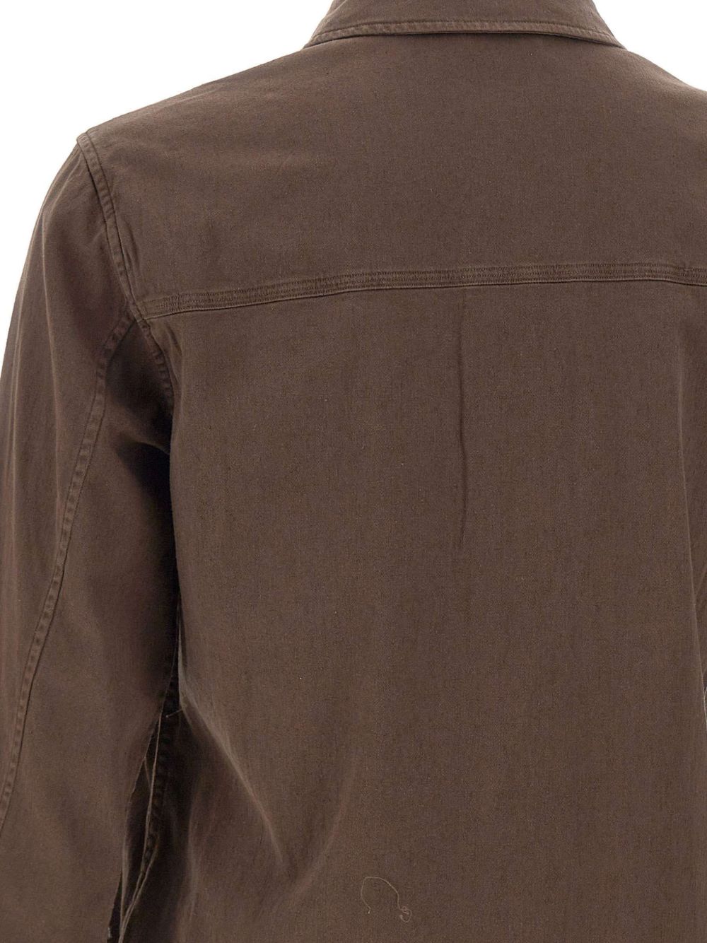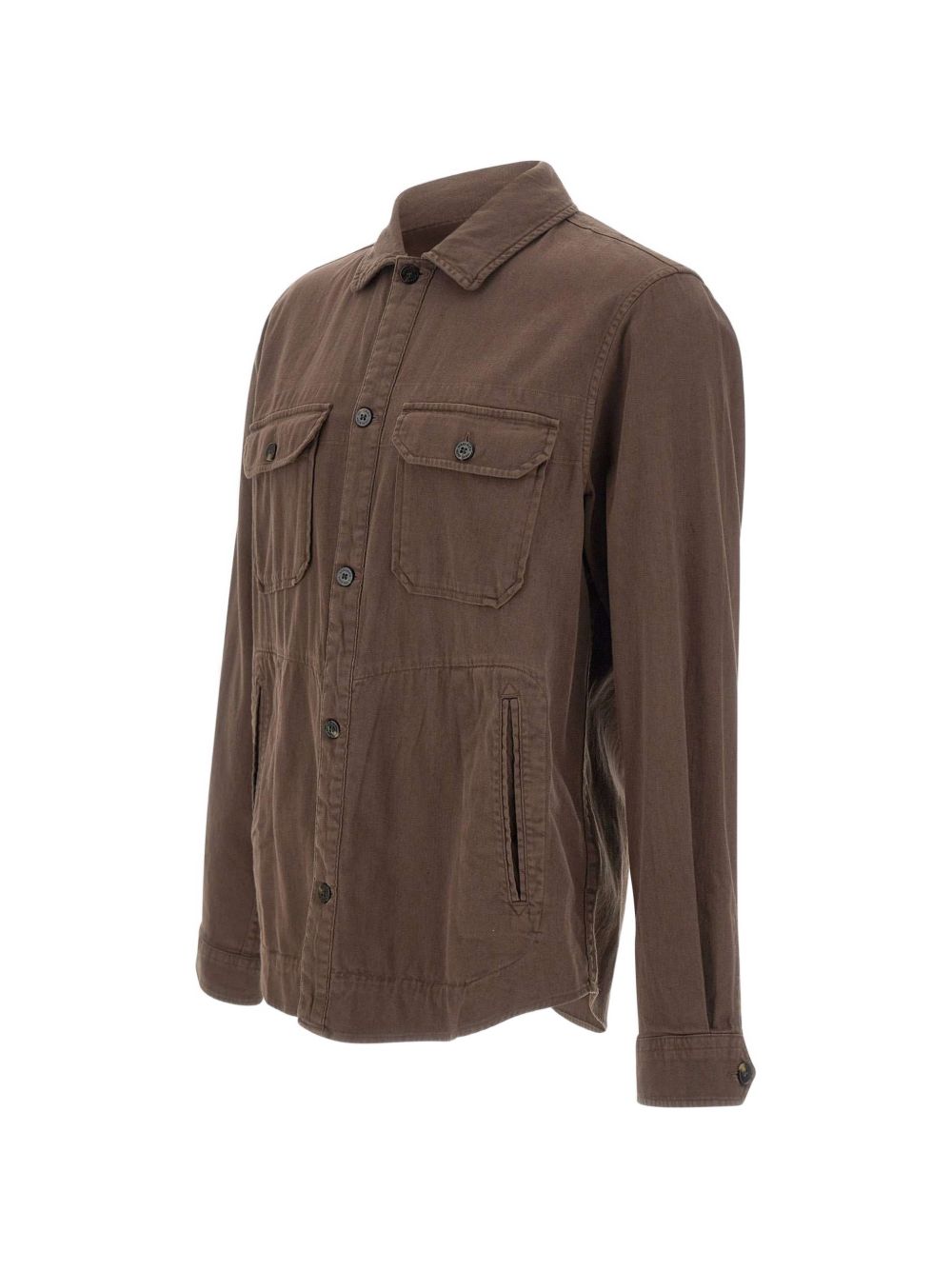 Realizzata in cotone e lino elasticizzati, colletto classico camicia, chiusura con abbottonatura, due tasche sul petto con bottone, tasche ai lati a filetto, 68% cotone, 30% lino, 2% elastane