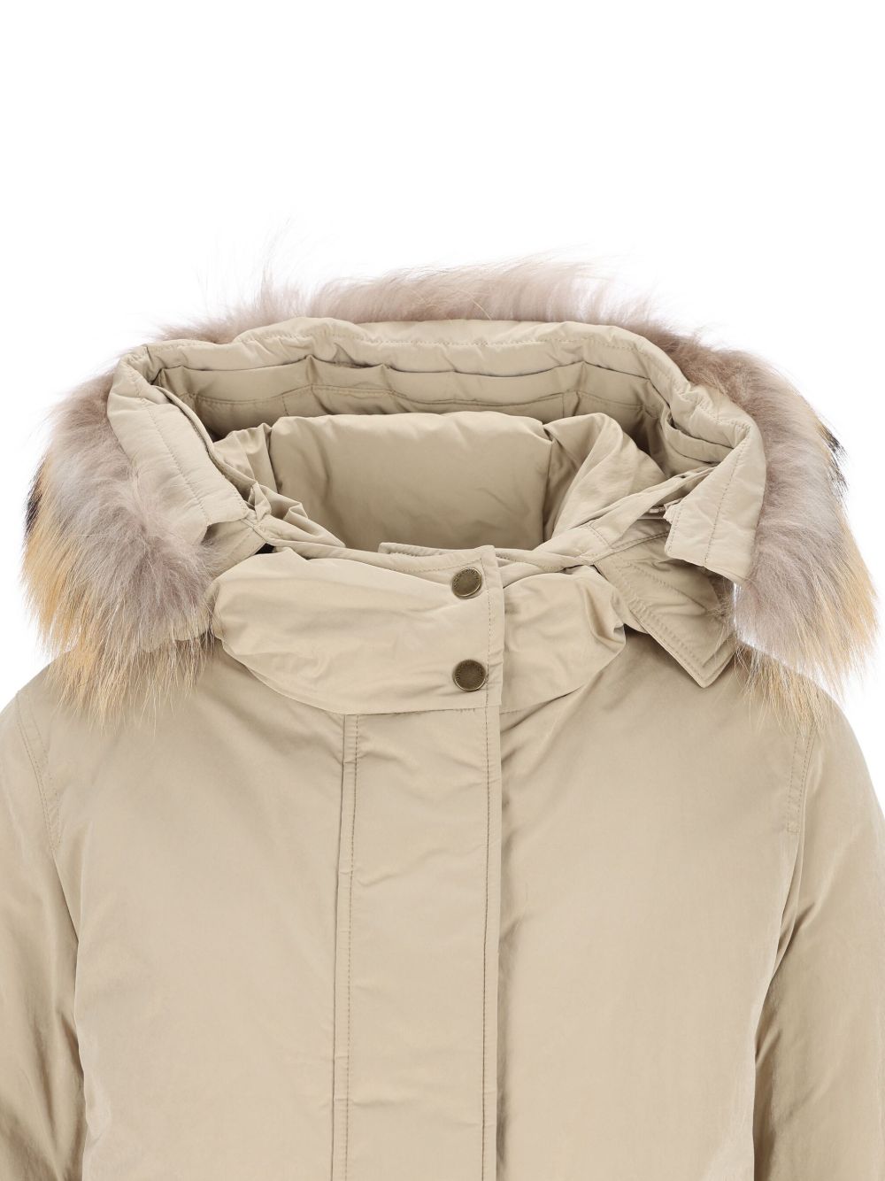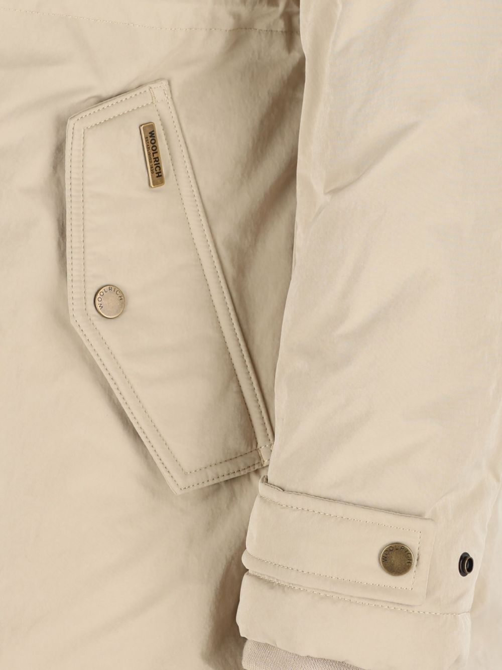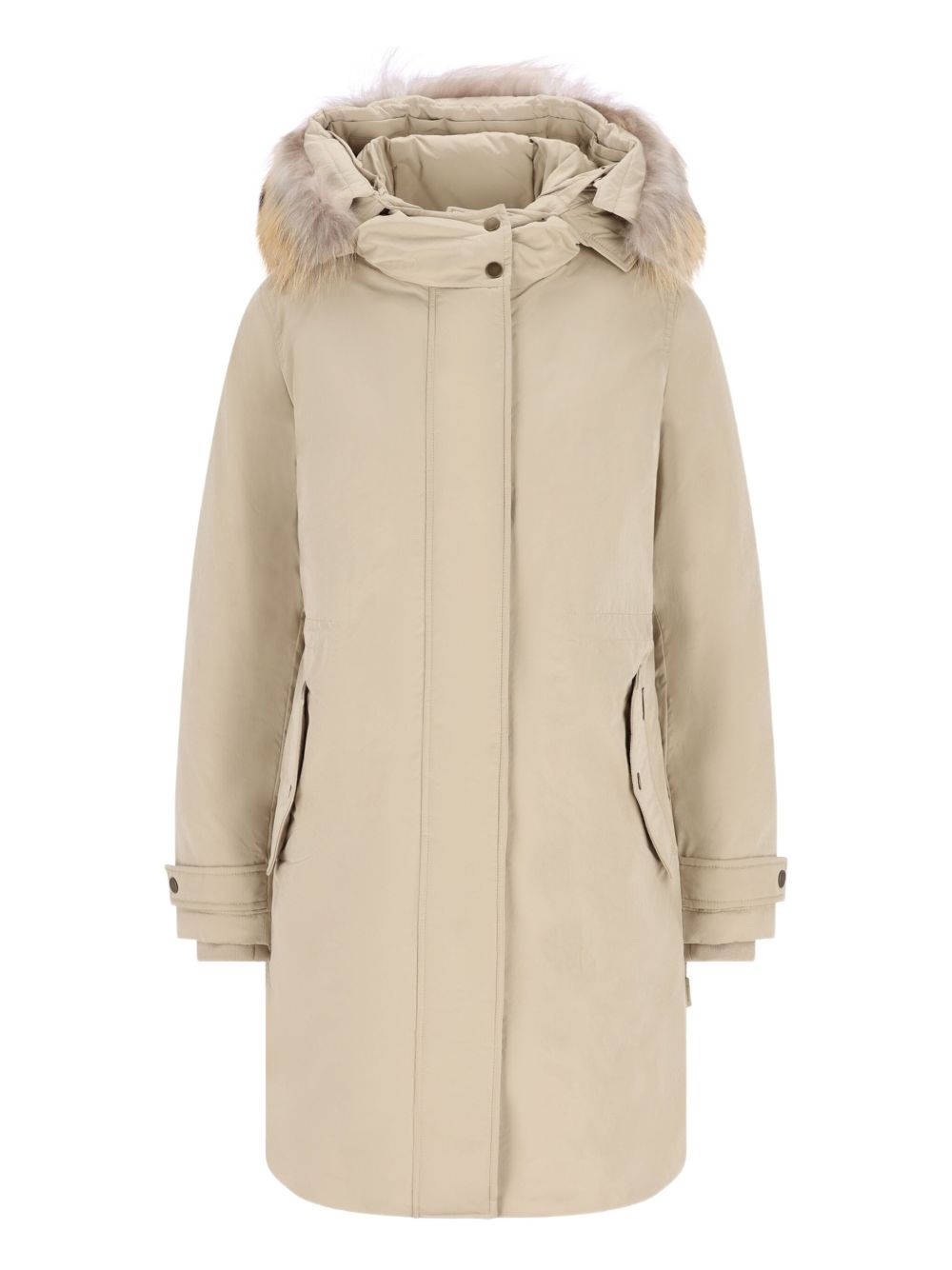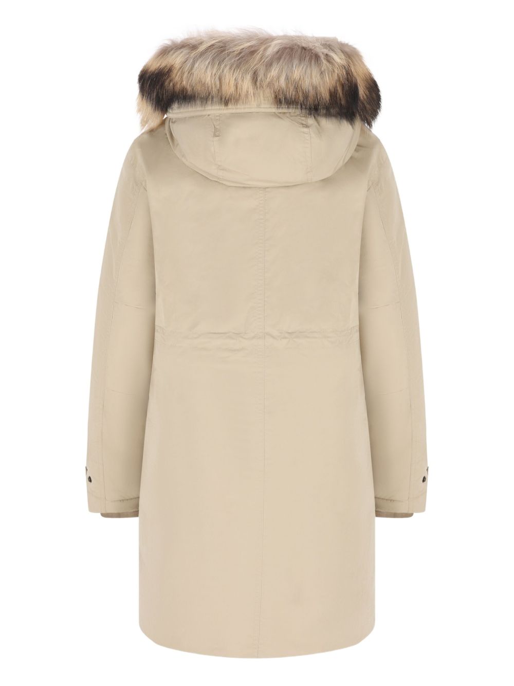 Realizzato in Peached Poly, trapuntatura interna Chevron, chiusura davanti con zip nascosta, polsini a costine, cappuccio con pelliccia removibile, collo alto con bottoni, chiusura frontale a zip, due tasche davanti con patta chiuse, tasca e coulisse interna.