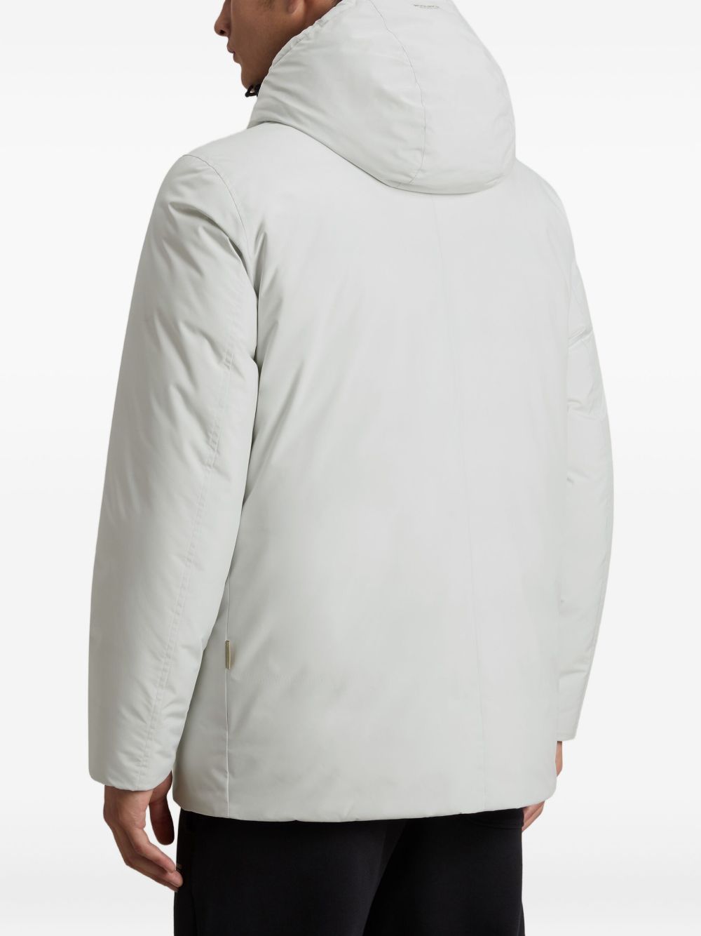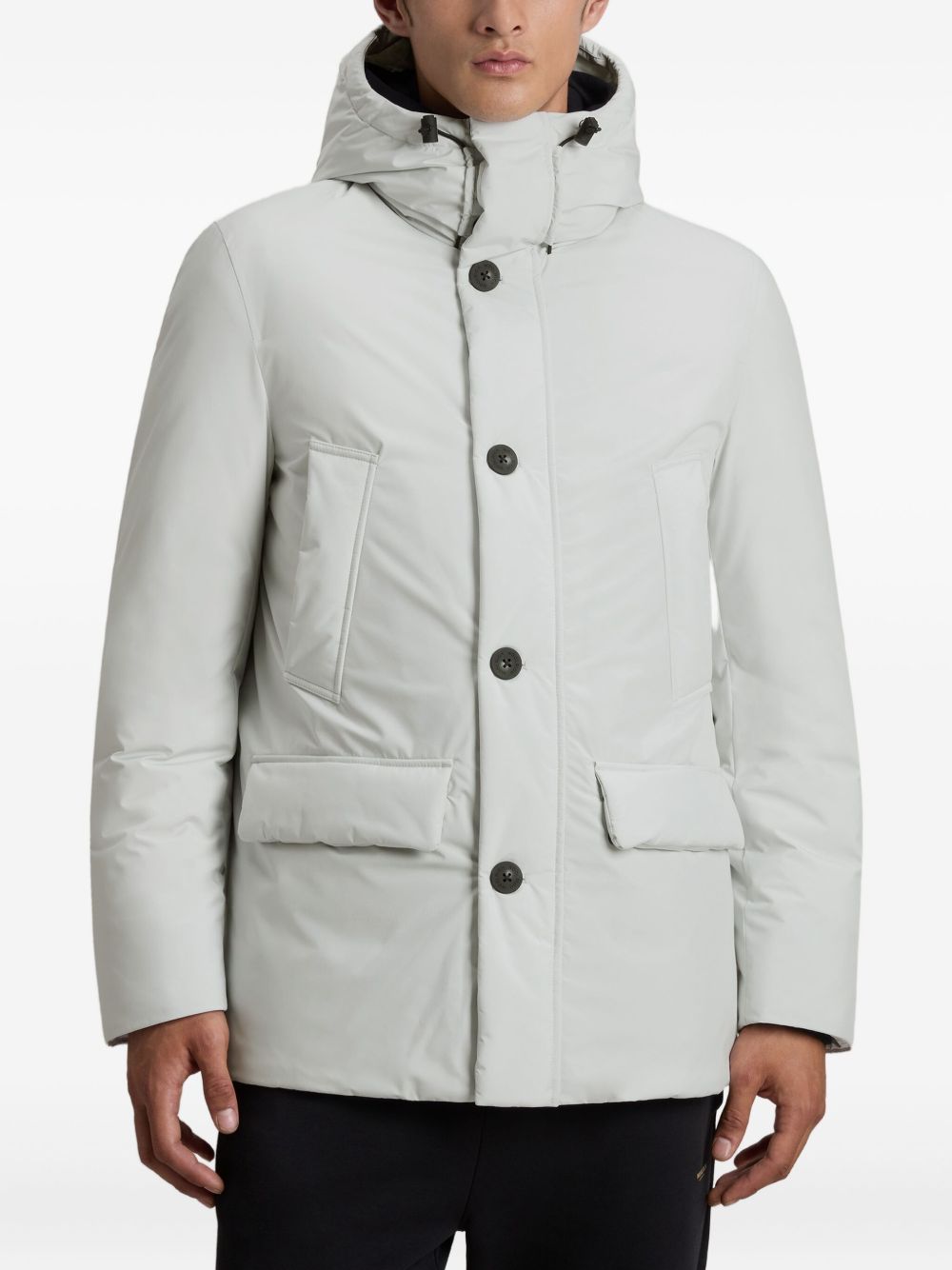 Realizzato in Cloud Poly, resistente al vento e idrorepellente, polsini a costine, cappuccio regolabile con fermacorda logata, chiusura frontale con bottoni e zip nascosta, due tasche sul petto e una interna con cerniera, due tasche con patta e bottoni, etichetta logata laterale.